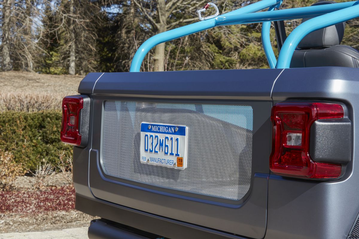 Relocation of the spare tire to the cabin provides an opportunity for another custom touch: concept storage packs mounted to the tailgate for transport of gear and supplies such as food, water and tools. The packs feature a split design to accommodate the rearview camera. A concept rock step — a unique combination of a rock rail/side step — completes the Jeepster.