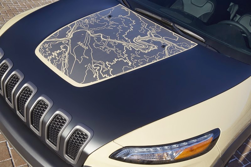The Cherokee Canyon Trail’s Desert Tan exterior paint is accented with a Satin Black hood that includes a topographical hood decal showcasing Hell's Revenge, a renowned off-road trail in Moab. The exterior also displays Jeep Performance Parts body decal, Satin Black roof accent colors and the 2015 "Four Wheeler of the Year" decal.