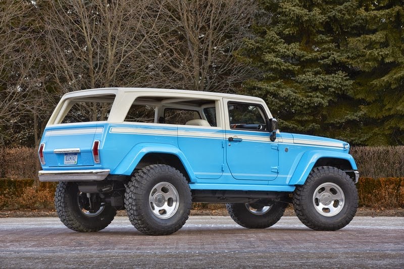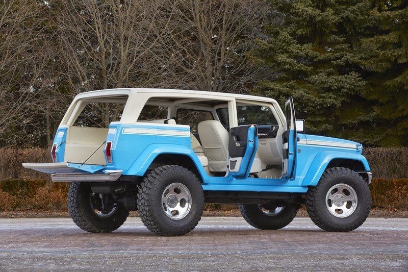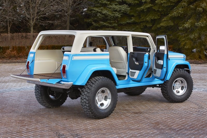 Custom exterior design cues include a vintage Ocean Blue exterior color scheme with a white, French Bread roof; a custom modified razor grille that the original Wagoneer made famous; halogen headlamps; removable sides for an open-air feel and flexible hauling; chrome front and rear bumpers and classic, 17-inch slotted mag wheels for a true ’70s vibe.