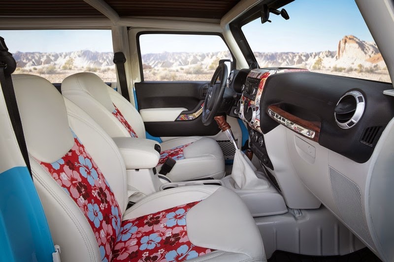 Jeep designers developed the Hawaiian themed interior complete with Jeep-designed “Surfer” pink, blue and white flowered cloth and leather-trimmed seats; vintage-style surf stickers on the center console and door handles; a Rosewood front-passenger grab handle and tiki-style shifter handle; and Uconnect 8.4-inch touchscreen media center.