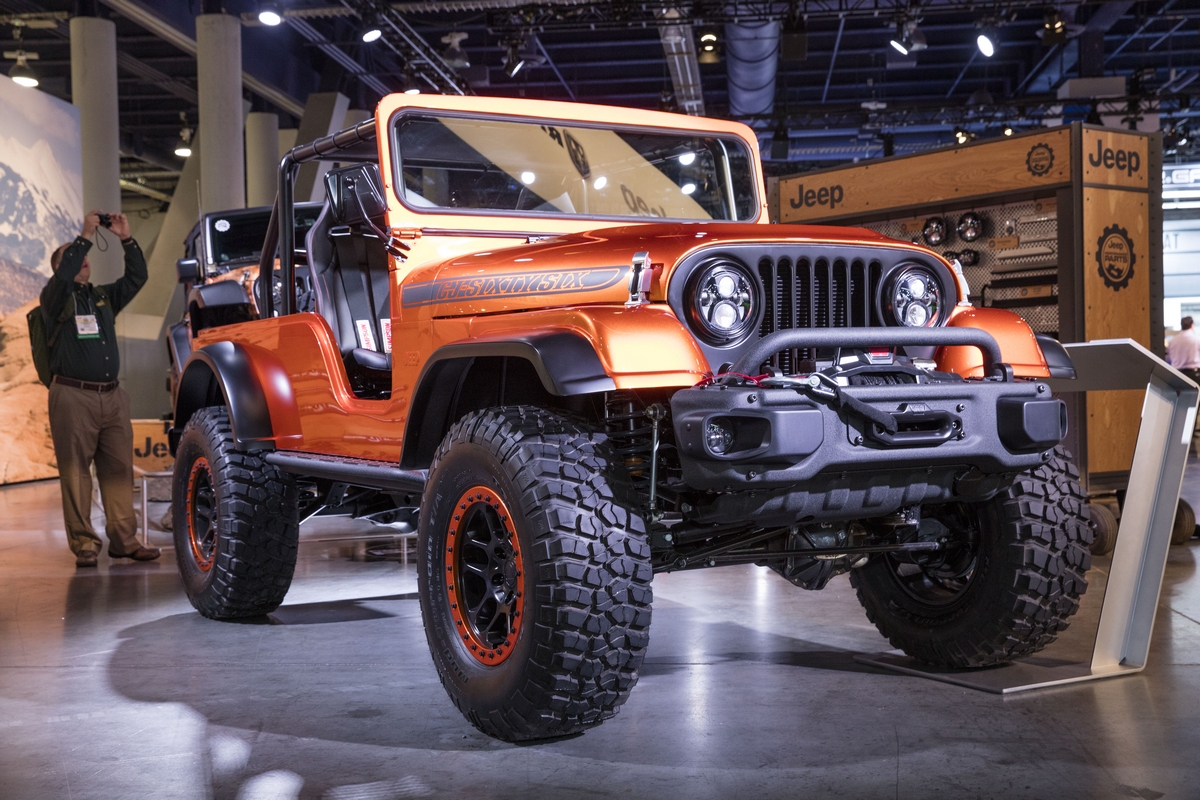 Take a Jeep Wrangler TJ frame, hang a 1966 Jeep Wrangler CJ universal Tuxedo Park body on it, add in Wrangler JK elements and fuel it with new Mopar-powered products set to be revealed later on Tuesday at the Mopar SEMA press event, and you’ve got the Jeep CJ66. The unique cocktail of three Jeep vehicle generations demonstrates that new Mopar power applications are also available for those more at home on the trail than the street.