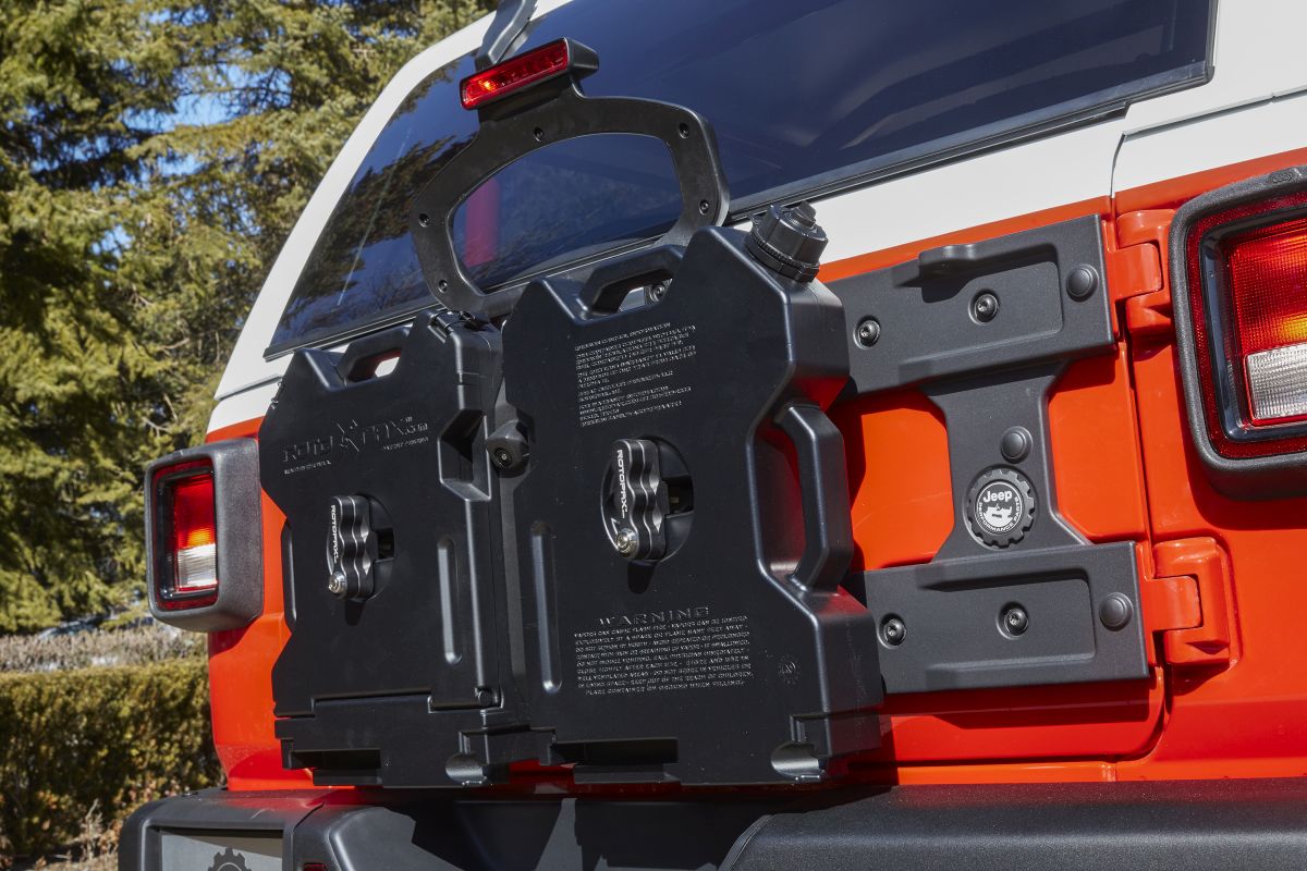 Relocation of the spare tire to the cabin provides an opportunity for another custom touch: concept storage packs mounted to the tailgate for transport of gear and supplies such as food, water and tools. The packs feature a split design to accommodate the rearview camera. A concept rock step — a unique combination of a rock rail/side step — completes the Jeepster.