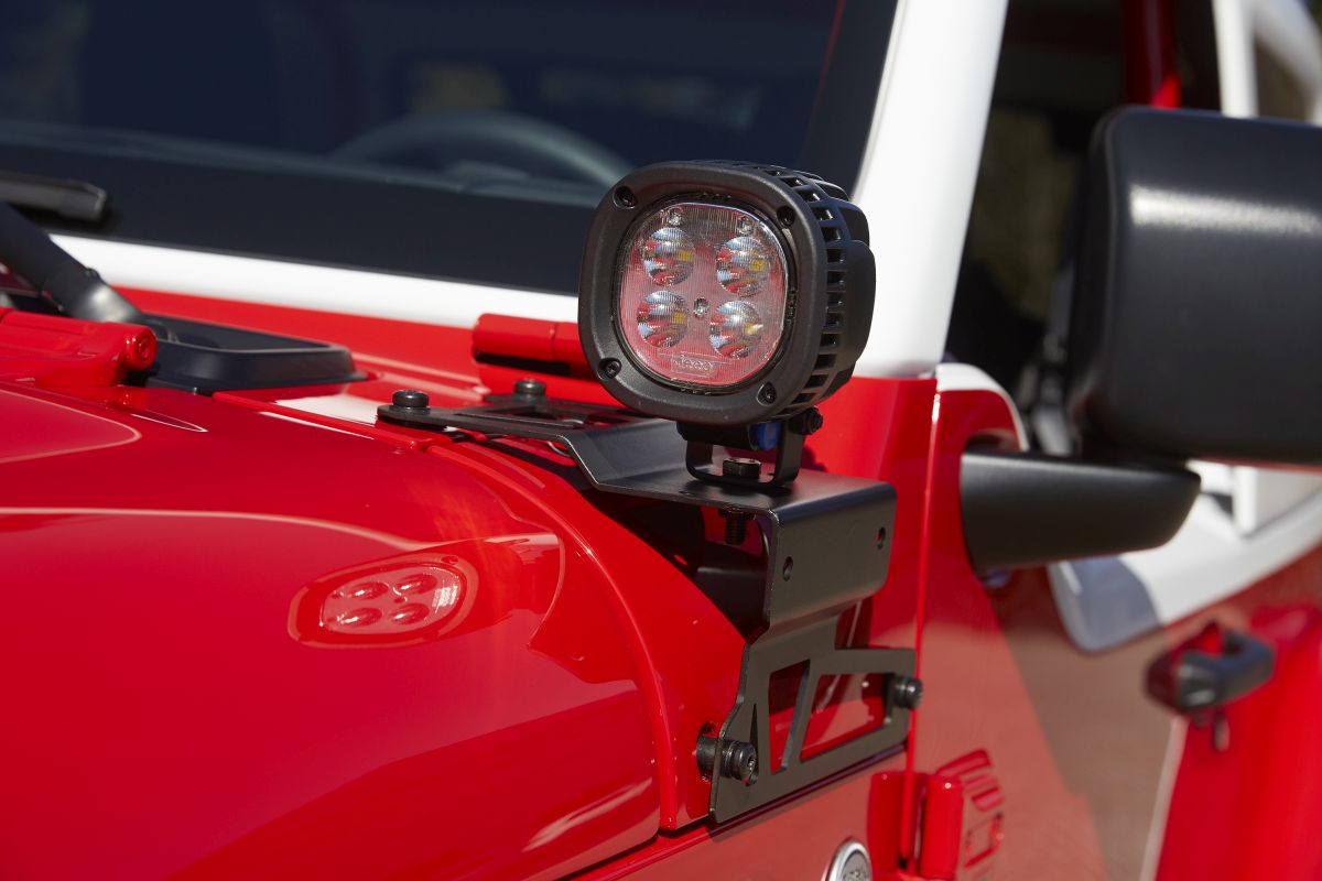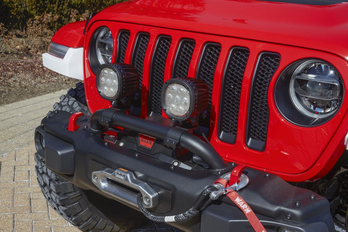 Superior trail visibility, inspired by the Jeep Luminator concept vehicle shown at Moab in 2017, is delivered by A-pillar and brush guard-mounted LED lights from the Automotive Lighting division of Magneti Marelli, that mount via JPP brackets. Automotive Lighting LED header lights seal to the windshield for extra forward illumination, and a rear off-road scouting light uses four-color LEDs to communicate trail conditions: stop (red), 1-3 miles per hour (amber), 3-25 mph (green) and a rear flood light (white).
