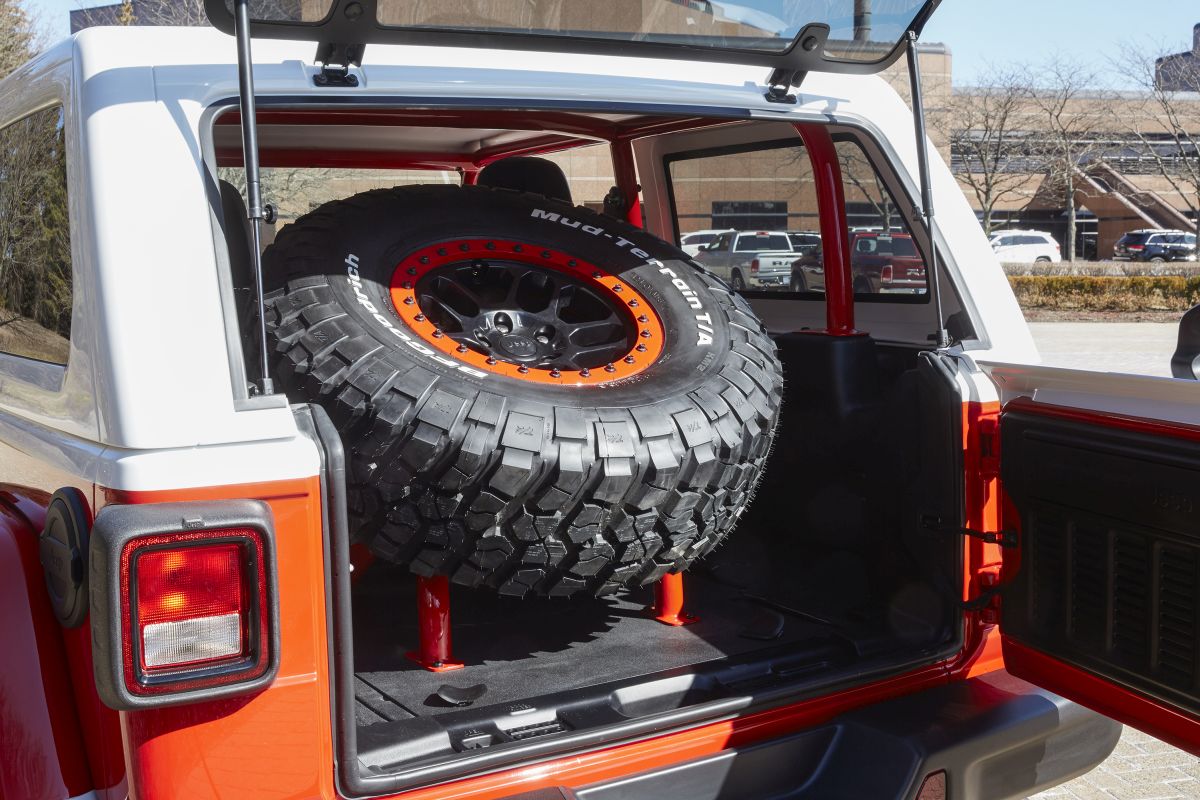 Inside the Jeepster, a concept tubular roll cage replaces the sport bar and an additional 38-inch tire is secured with a custom in-cabin spare tire carrier. The interior meshes off-road functionality with premium features, including black Katzkin leather seats with Rubicon Red Jeep grille logos embroidered on the seatbacks, and Rubicon Red accent stitching on the seat bolsters. The instrument panel inserts are Firecracker Red to tie in with the exterior.