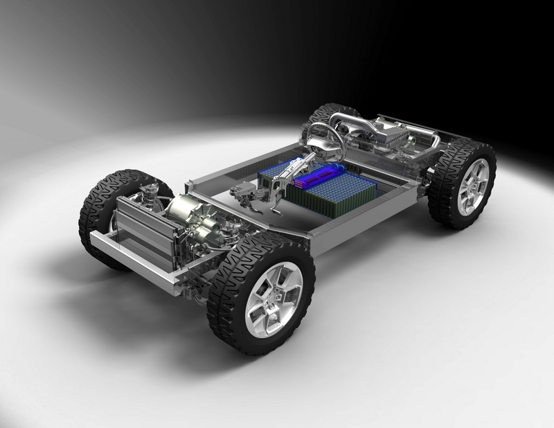The advanced propulsion system in the Jeep Renegade concept starts with a 40-mile lithium-ion battery pack. A range extender – in Renegade’s case, a small-displacement (1.5-liter, 3-cylinder) BLUETEC diesel engine – allows for journeys beyond 40 miles. In fact, the Jeep Renegade concept boasts a 400-mile range.