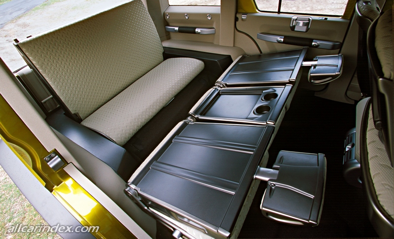 Featuring all-new body-on-frame construction with hydroformed frame rails and riding on an 80-inch wide chassis with 123-inch wheelbase and 37-inch tires, the Jeep Rescue is built for anything thrown its way. The front hydropneumatic suspension combines with the heavy-duty link-coil rear suspension to give the Rescue its solid footing on all terrain. The suspension has adjustable ride height and an additional 4-inch lift available for fording. The aforementioned 37-inch tires feature an MTR tread and run-flat capability, negating the need for a spare. On-board tire pressure control has the ability to “tune” tire pressures for maximum traction on all surfaces.