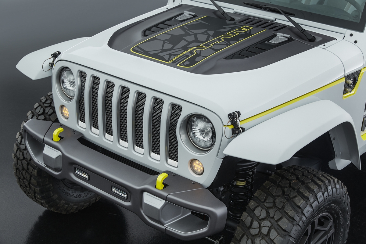 This high-tech, Wrangler-based concept features a translucent hard-top roof panel, two-level aluminium cargo rack with incorporated drone, a raked windshield, boatsided rocker panels, LED headlamps, and custom LED tail lamps and parking/turn lamps.