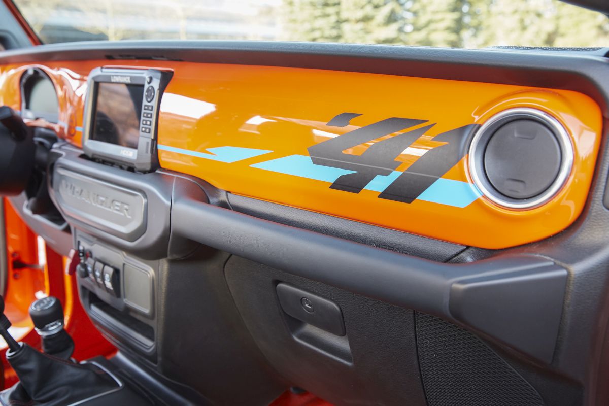 Black metal concept rock slider guard the J-Wagon’s exterior, and a matching black metal concept JPP roof rack offers utility and functionality to fit any lifestyle. A black JPP fuel door and Orange Crush accents on the Jeep badge and tow hooks add style points. A spare 35-inch KM3 BF Goodrich tire mounts to the spare tire tailgate hinge reinforcement, and includes the JPP Center High-Mount Stop Light (CHMSL) light relocation kit.