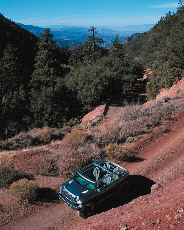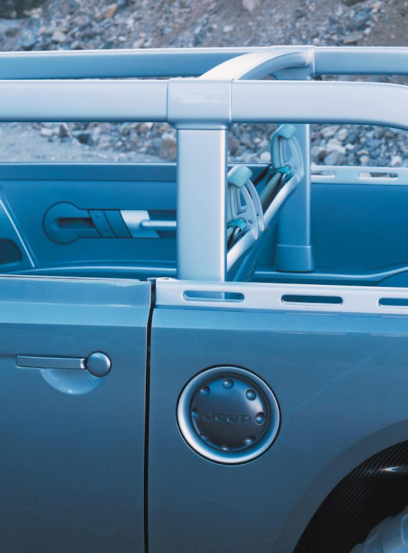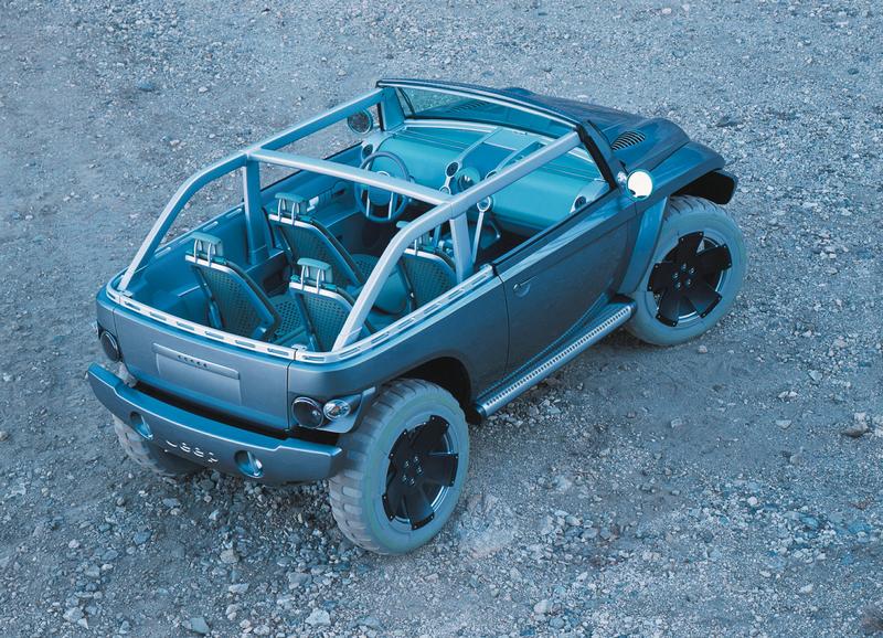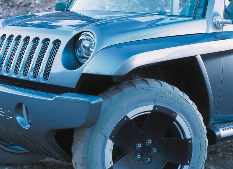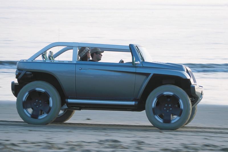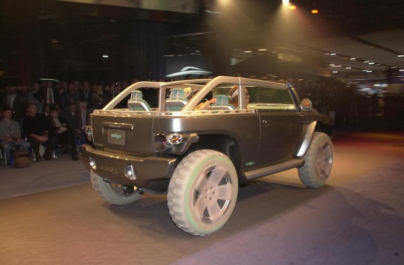 The Willys, unveiled at the 2001 North American International Auto Show in Detroit, features plastic body-technology, allowing for a radical approach to Jeep design while remaining true to the brand's characteristics.