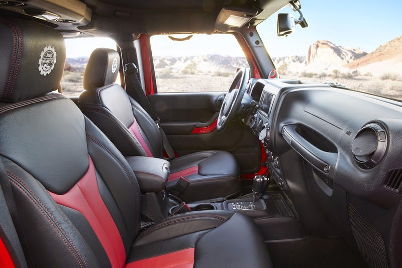 The interior stands out along with the exterior with embroidered black and red Mopar Katzkin leather seats, Jeep Performance Parts logo embroidered on the headrests, red accent bezels, grab handles and all-weather floor mats.