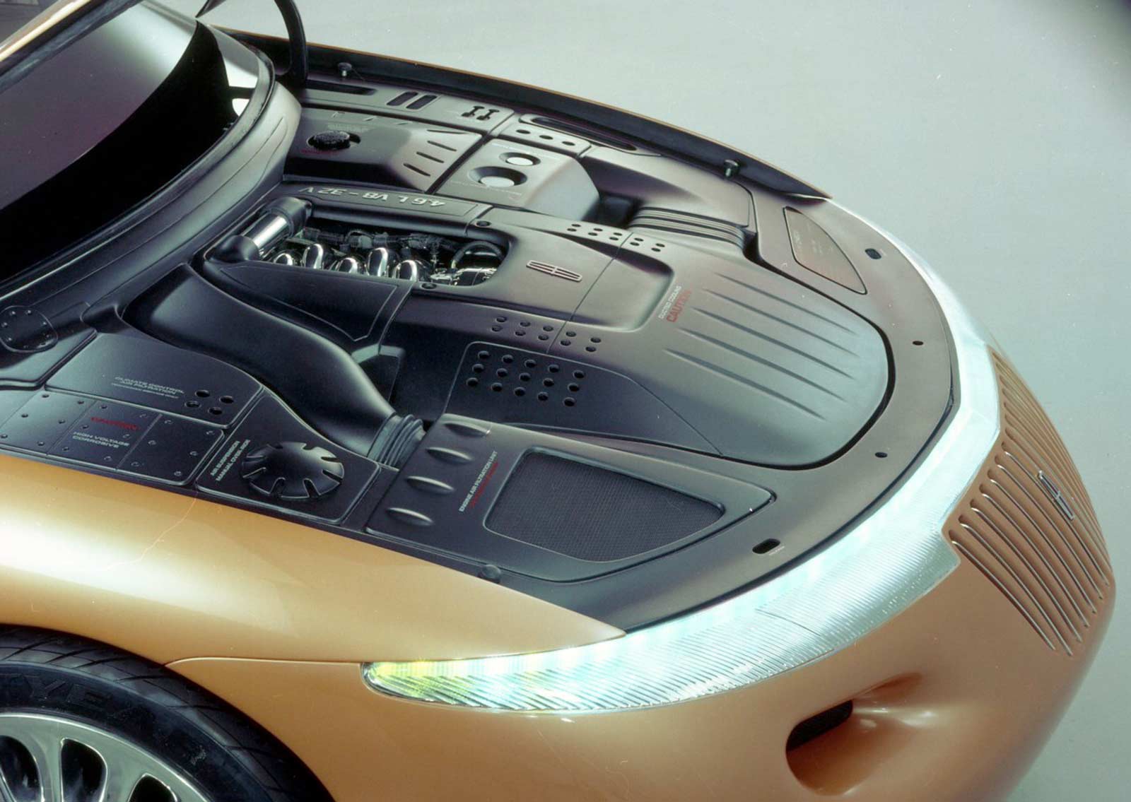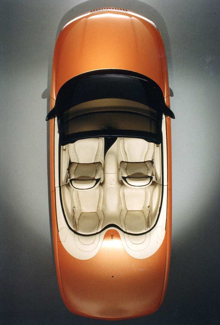 The leather interior is soft and sculptured with integrated seats, dual air bags and comfortable wraparound rear seating. The oval-shaped exterior design further is complimented with a strong, horizontal band that graphically encircles the interior compartment, flowing through the instrument panel into the doors and around the rear seat. The band houses many of the individual controls for each of the passengers and creates a clean, uncluttered appearance.