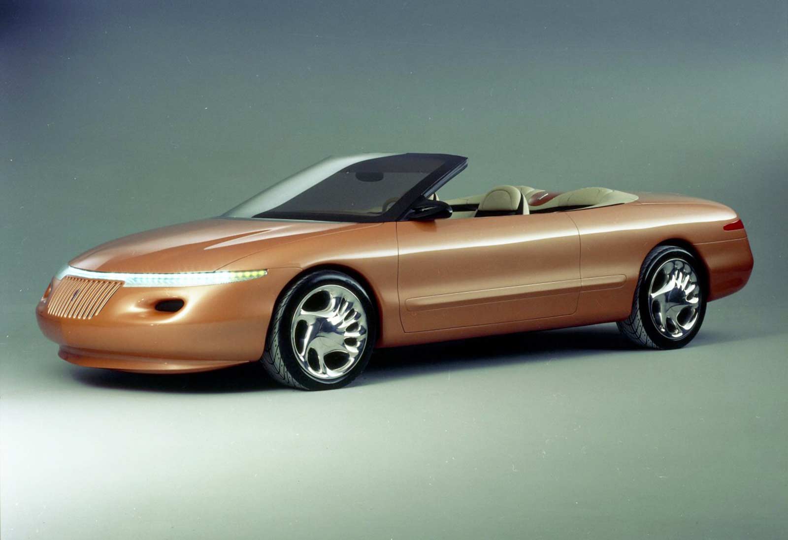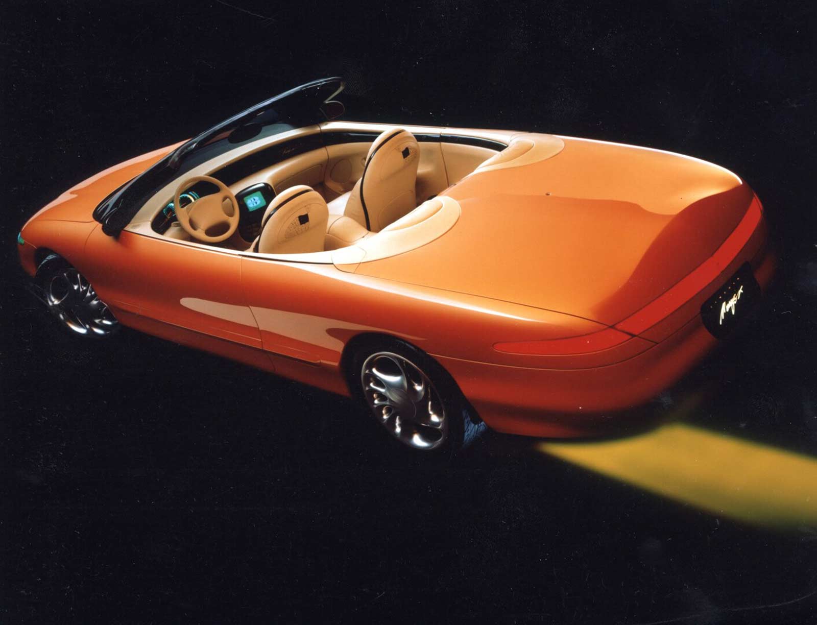 Lincoln's Marque X concept convertible, painted a burnt tangerine pearl orange hue, showcased a cab-forward design to maximize the space available for people. This future flagship featured a simulated spare-tire bulge on its decklid, speed-sensitive front underbody spoiler, low-profile fiber optic headlights, 19-inch cast magnesium wheels, and an electronic, speed-sensitive aerodynamic spoiler. Under the hood sat a 32-valve DOHC V-8, matched to a four-speed automatic transmission. A coded "credit card" was used to start the engine, and in the leather cockpit was a voice-activated telephone, navigation system, and fax machine. For rear passengers, the Marque X contained a pop-up TV and dual temperature food and beverage storage container.