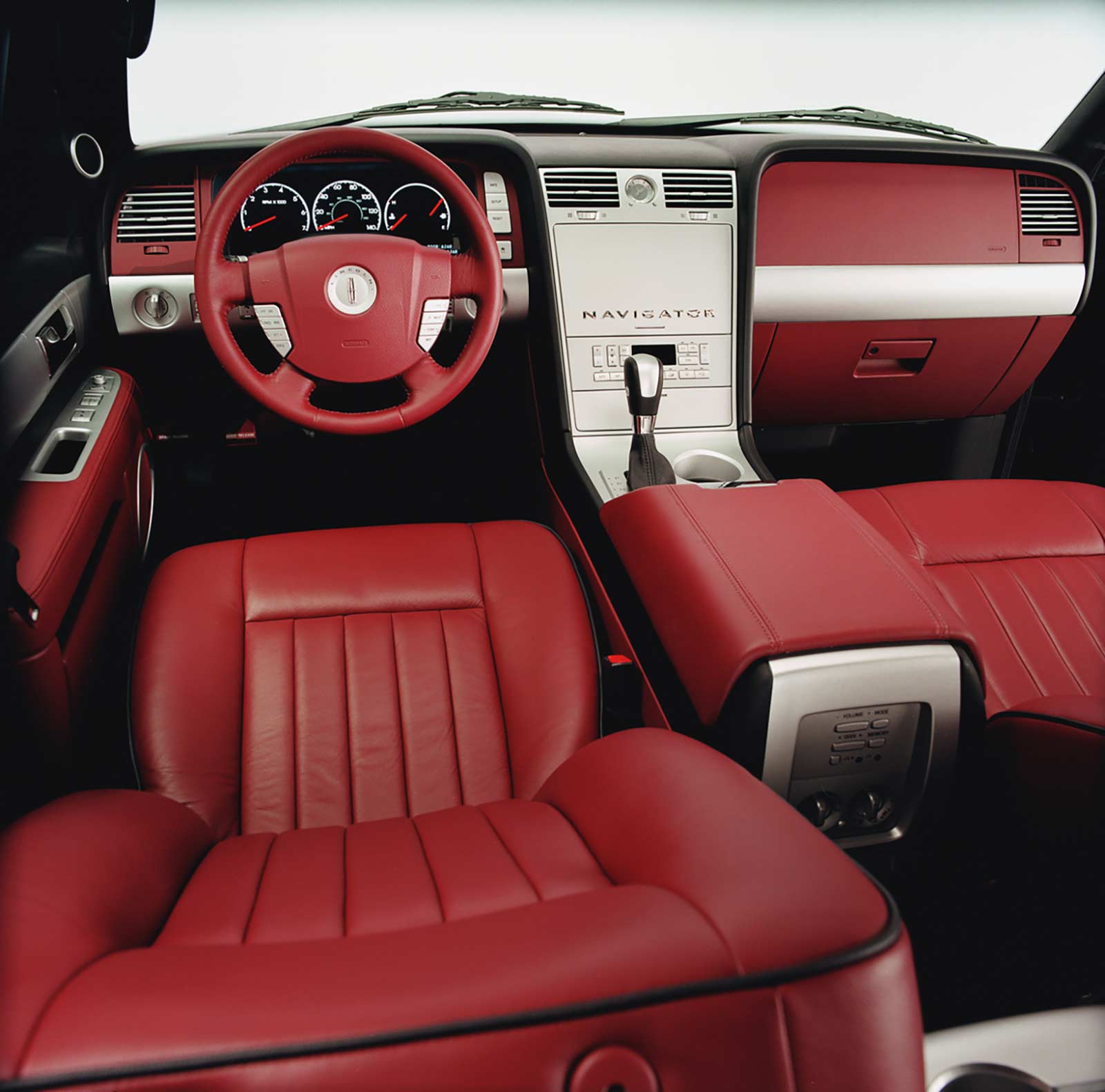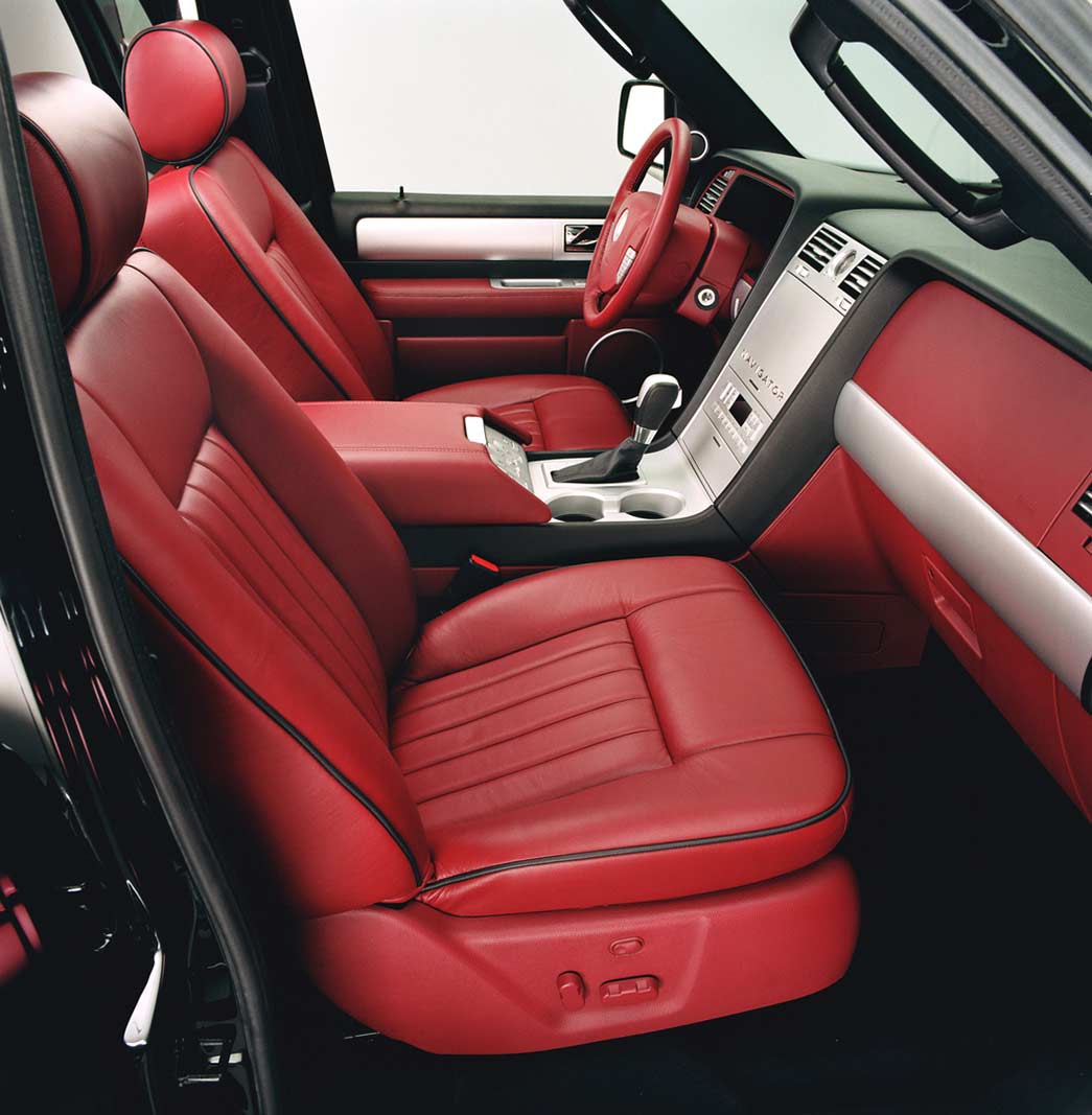 Inside, wood accents have been replaced by bright satin nickel finished interior surfaces. Black, high-pile luxury carpet and a black instrument panel are contrasted by rich, garnet leather-covered seats and a garnet leather-wrapped center console cover. These enhancements to the interior add to the Navigator’s already high level of comfort and luxury.