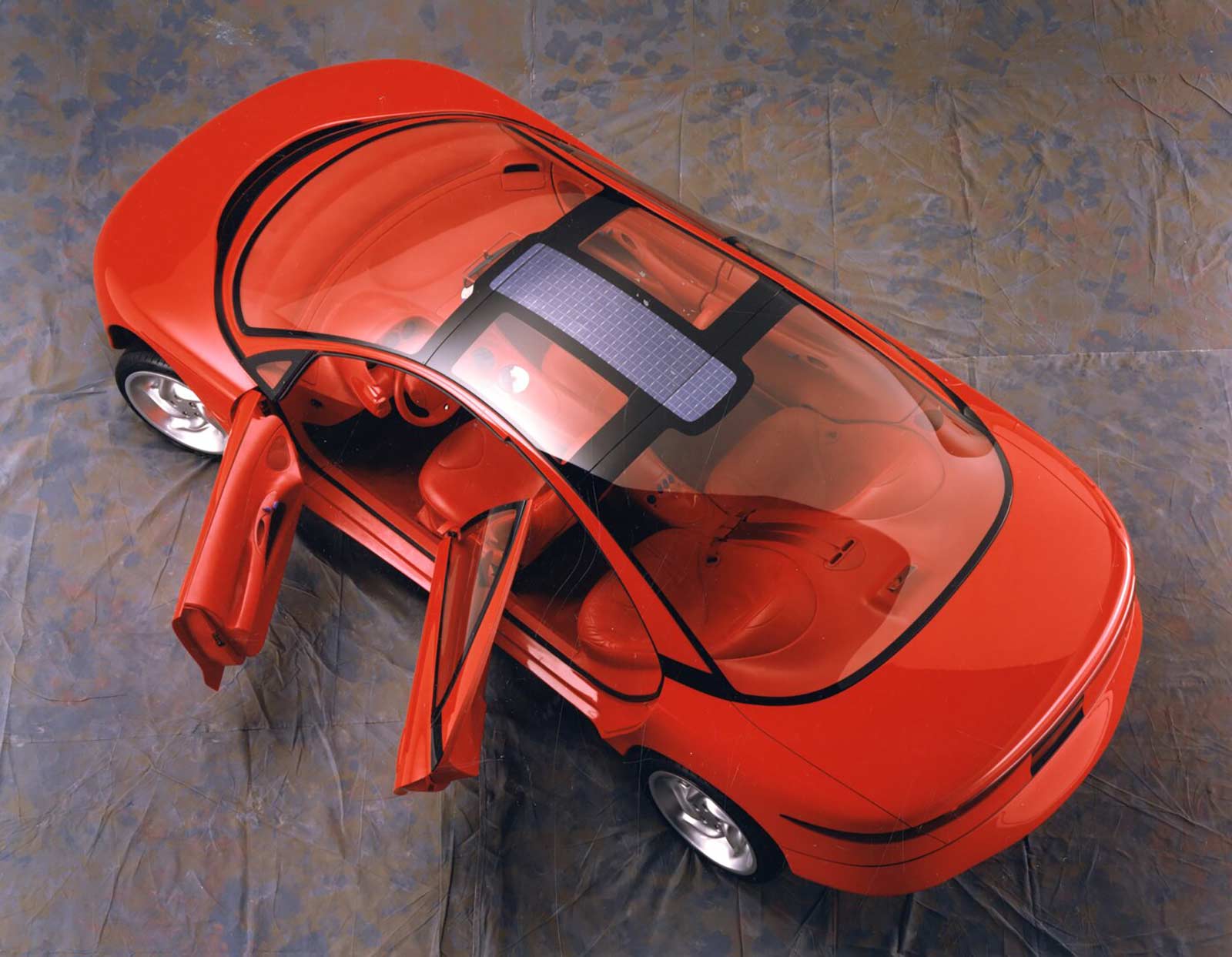 Among the unique features of Cyclone is a liquid crystal glass roof which can be changed from transparent to opaque with an electric control, allowing the driver to adjust for changes in sunlight conditions. In the transparent mode, about 35 percent of visible light is transmitted through a flexible film laminated to the inner surface of the glass. With a flip of a switch, light is diffused, allowing transmittance of less than five percent.