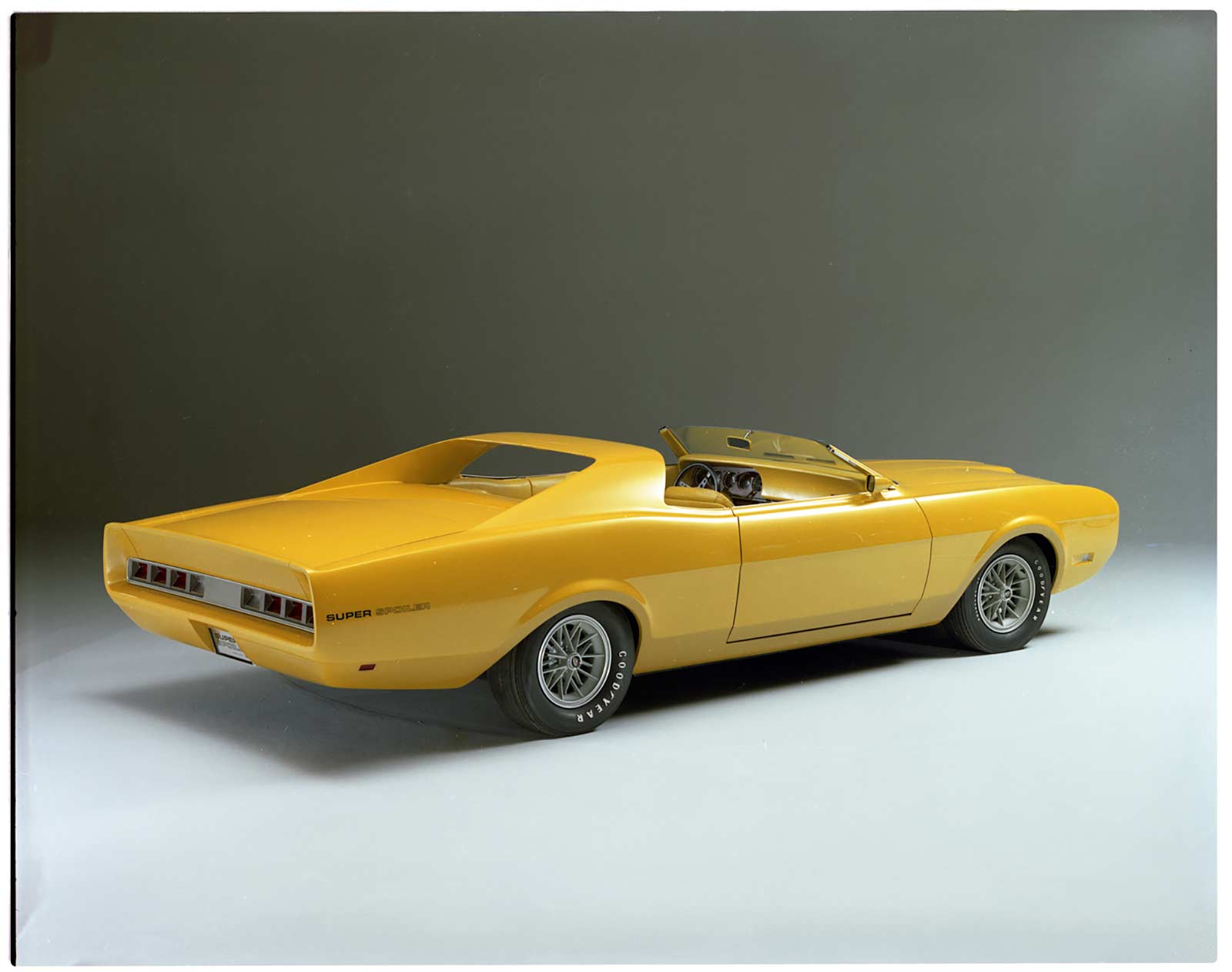The Super Spoiler cut the roof off of the production Cyclone and replaced it with a built-in roll bar. There were four bucket seats, and Marauder X-100 taillights. Notice the "duck tail" spoiler blended into the body.