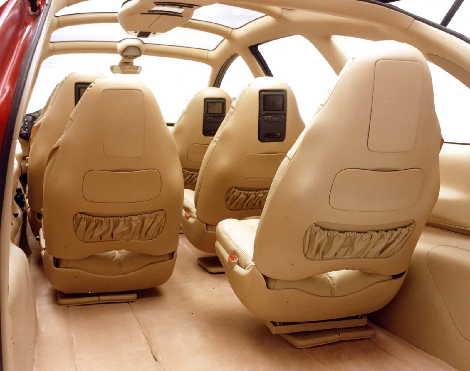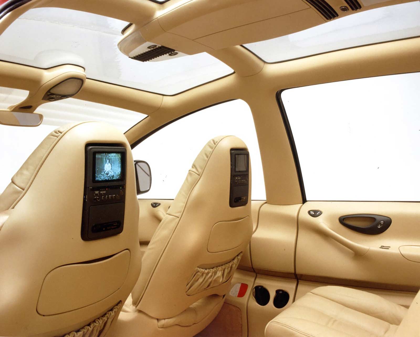 Passengers individually can select programs to view on a television/VCR entertainment system mounted in the seat backs. Cupholders, trays and storage compartments also are available for passengers in the second and third rows. The roof console incorporates air conditioning and heat registers, lighting and storage compartments for glasses, video tapes and compact discs. Umbrella storage is built in behind the front doors.