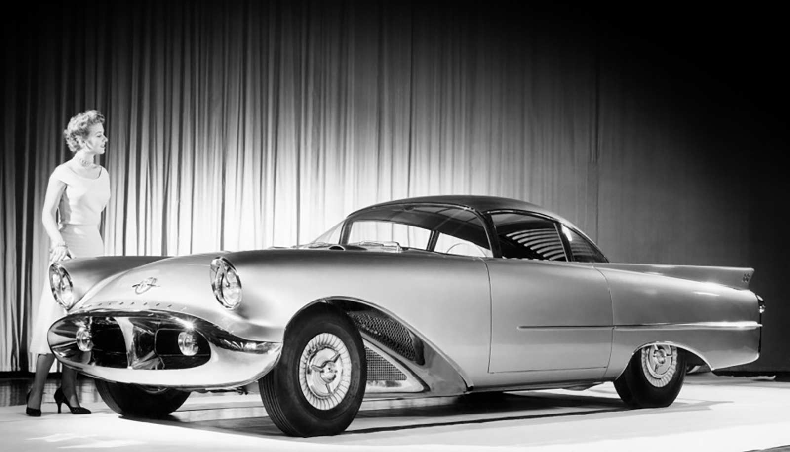 1954 Oldsmobile F-88 concept car was a 2-passenger model with recessed sports car-type seats, a panoramic windshield, jet airfoil wheel disks and a recessed license plate.