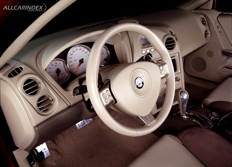Grand Prix’s unique “four-door” coupe styling, which was first introduced in 1997, is taken further in the G-Force show car with a longer roof/short deck proportion and a more pronounced “wedge” side profile design. Design details like sculpted taillights, power-bulge hood, exaggerated wheel flares and headlamps that extend naturally from the hood and fender sweeps are integrated into the total shape of the car. Carbon fiber front and rear lower fascias add lightweight material to the performance-oriented appearance.
