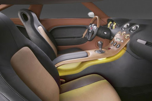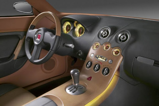 A curved wood center console is the interior's dominant feature and is attached to the dashboard via a tongue-and-groove joint. It also encapsulates the engine instruments. Blonde wood is used to convey lightness and airiness, while charcoal-colored leather and terracotta inserts accent the dashboard and upholstery. An aluminium band running the width of the interior serves as a divider for the interior's different elements. A matching aluminium handle greets those who open the Curve's doors, inviting them to plunge into a warm environment that reflects the friendly nature of the Saturn brand.