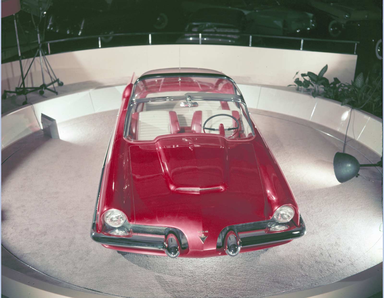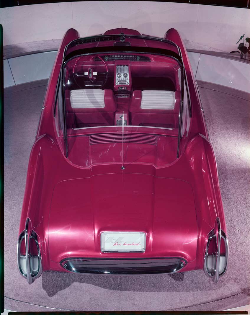 Externally, the XL-500 was a sight to behold with its scarlet fiberglass body and plexiglass roof. Standing at less than 57 inches high, the car featured arched rear fenders that allowed more space for the wheels, giving it a closer-to-the-road profile. The separation of the front grille and bumper into two units, along with a functional air scoop on the hood, lent the XL-500 an unusual front end appearance that was ahead of its time.