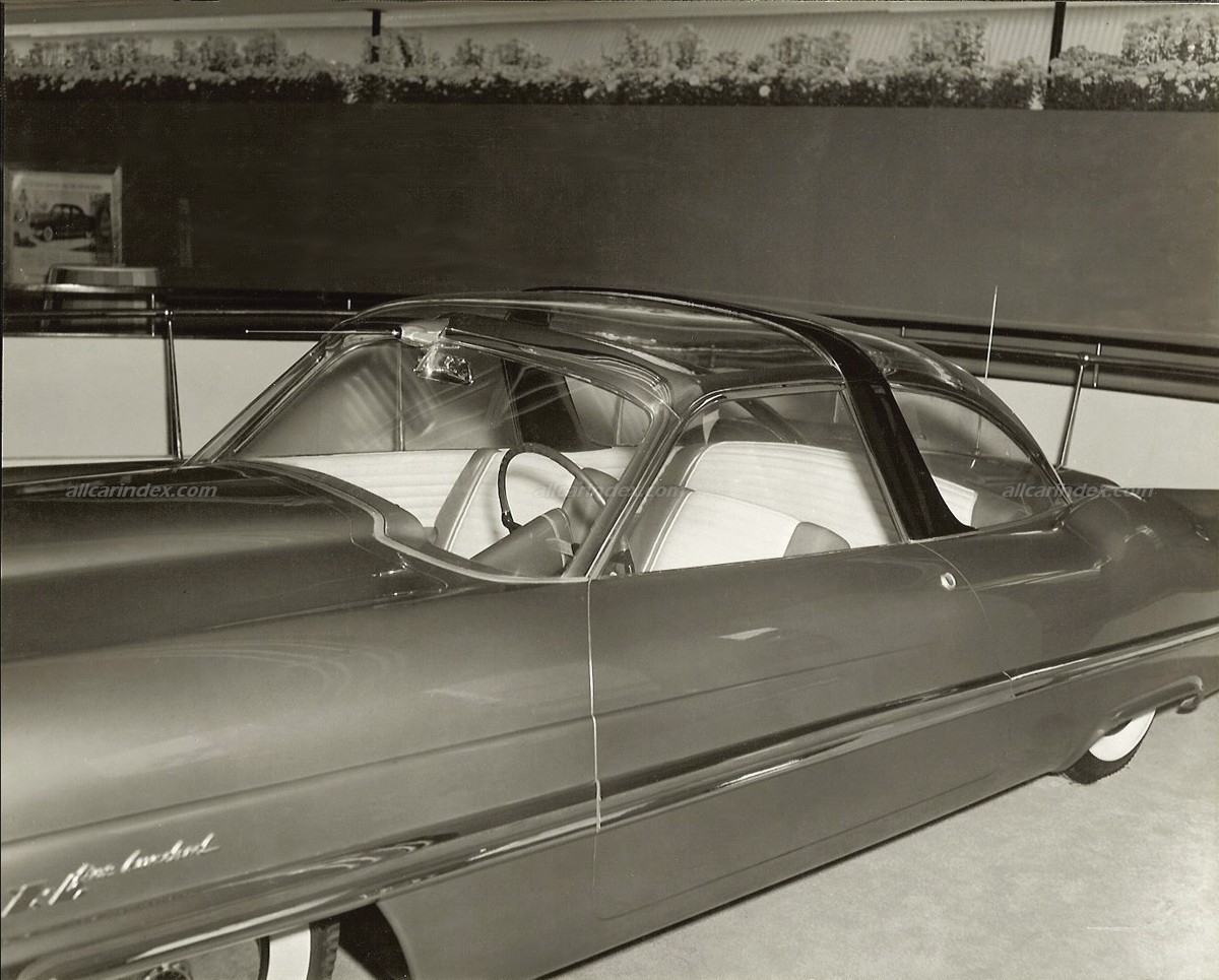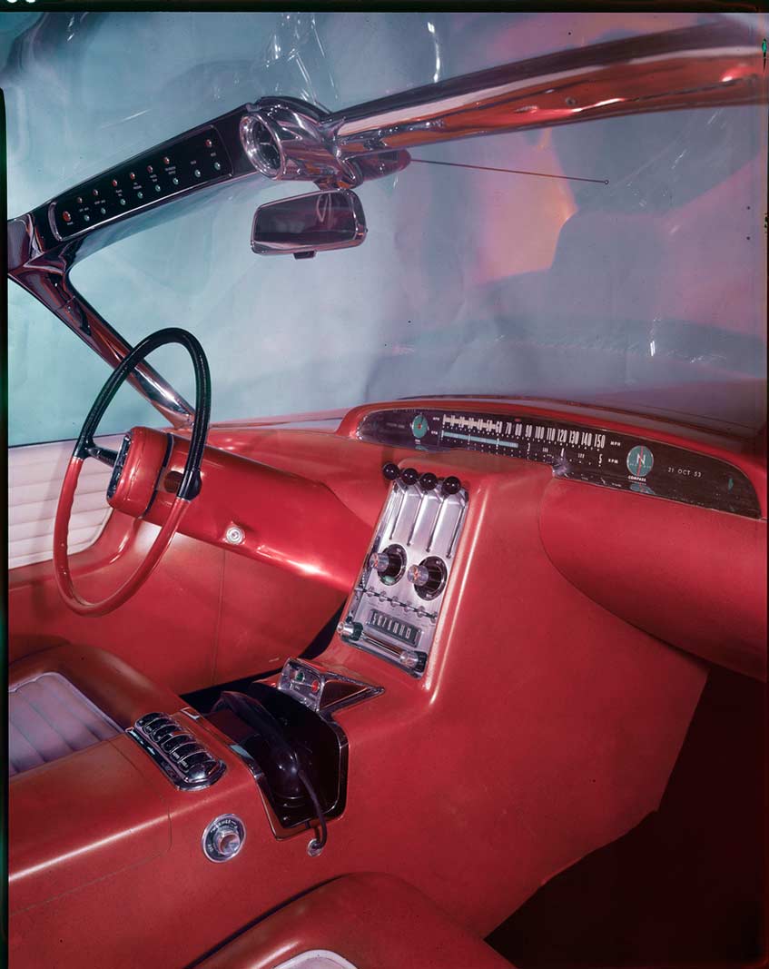 Safety and engine warning lights were strategically placed in the windshield header bar in front of the driver for quick and easy visibility. The main instrument panel featured a speedometer indicator showing speeds up to 150 mph, a stylized tachometer, a compass, a "magic eye" fuel gauge, and an electrically-operated calenometer, demonstrating Ford Motor Company's forward-thinking approach to automotive design.