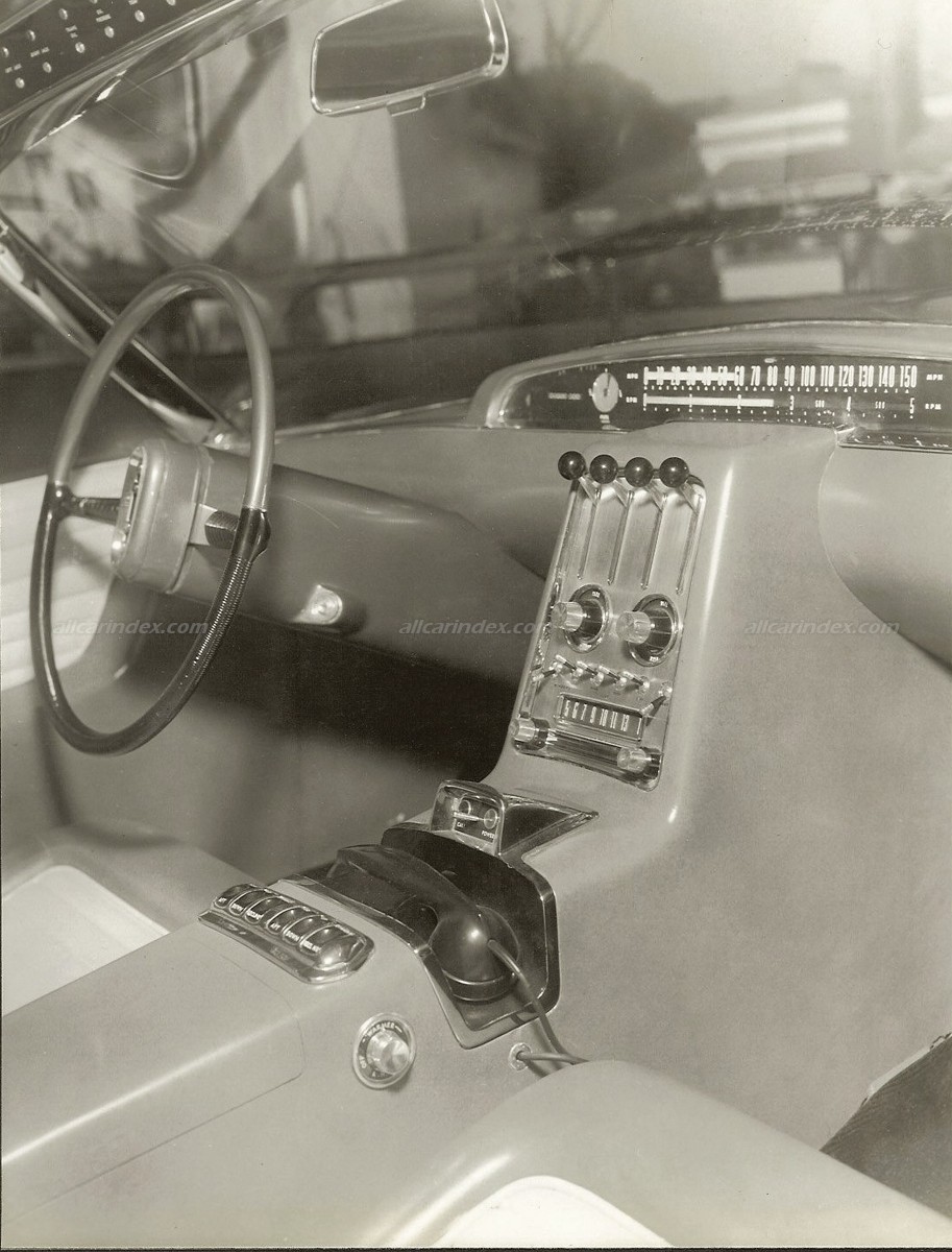 The XL-500 was also equipped with a myriad of experimental items, such as throttle type controls for air conditioning, lights, windshield wipers, and radio, which were grouped on an aircraft-type pedestal between the front seats. Additionally, toggle switches were included to operate features such as a telephone, dictaphone, automatic car jacks, air conditioning, and automatic hood and deck controls, showcasing the car's mechanical innovations.