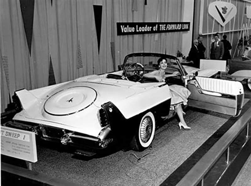 Despite its low height of only 53-1/2 inches, the Flight Sweep I comfortably seated four passengers in its spacious interior. The car's rakish look was accentuated by a sharply sloping windshield, upswept rear fenders, and tailfins that formed a striking trailing fin motif. Other notable design features included curved side window glass, fully flared wheel openings, and a unique two-piece counterbalanced deck lid with an externally mounted spare tire.