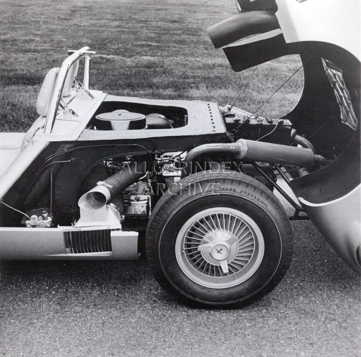 The Corvair Monza GT was a true showstopper with its innovative design features. The entire rear section of the fiberglass body hinged upward, allowing easy access to the air-cooled, six-cylinder opposed powerplant. Twin carburetors drew fuel from a 12-gallon tank located in the nose of the car, while engine cooling air flowed through intakes at the rear side panels. Twin exhaust outlets behind each rear wheel opening added to the sporty aesthetic.