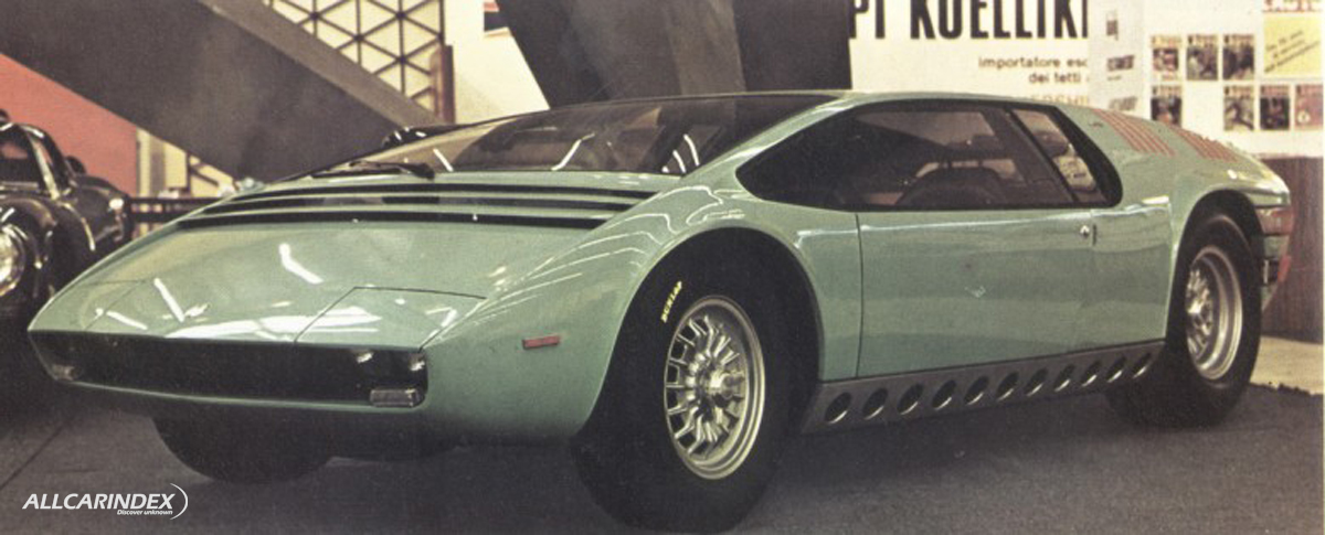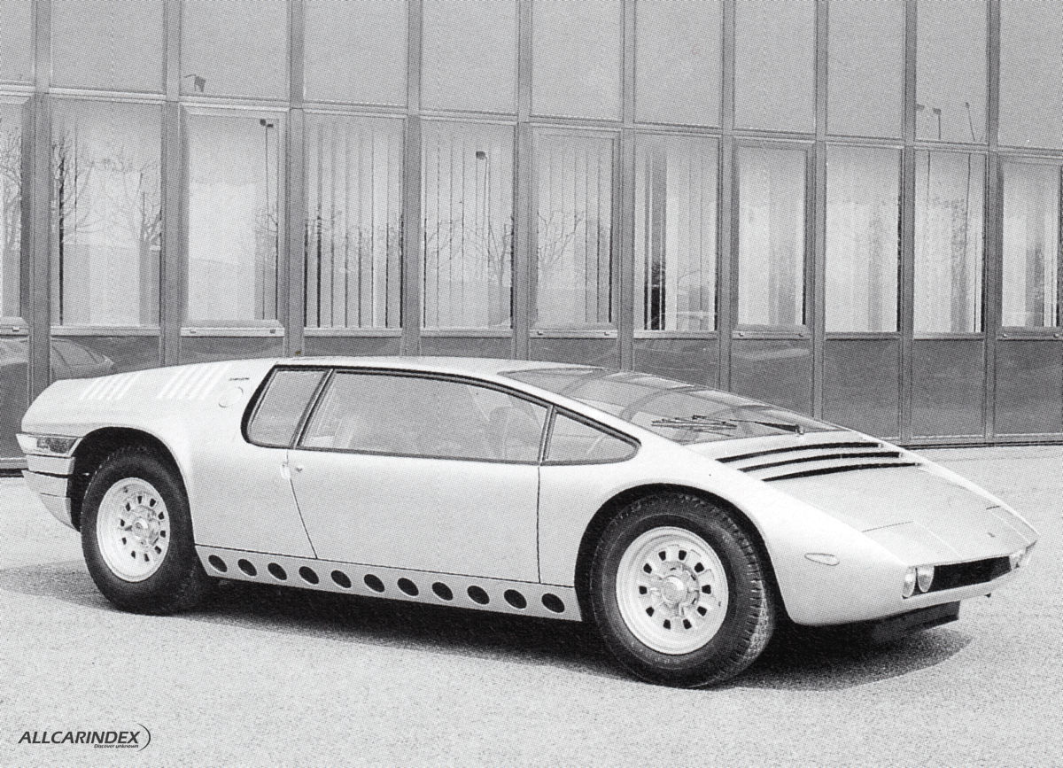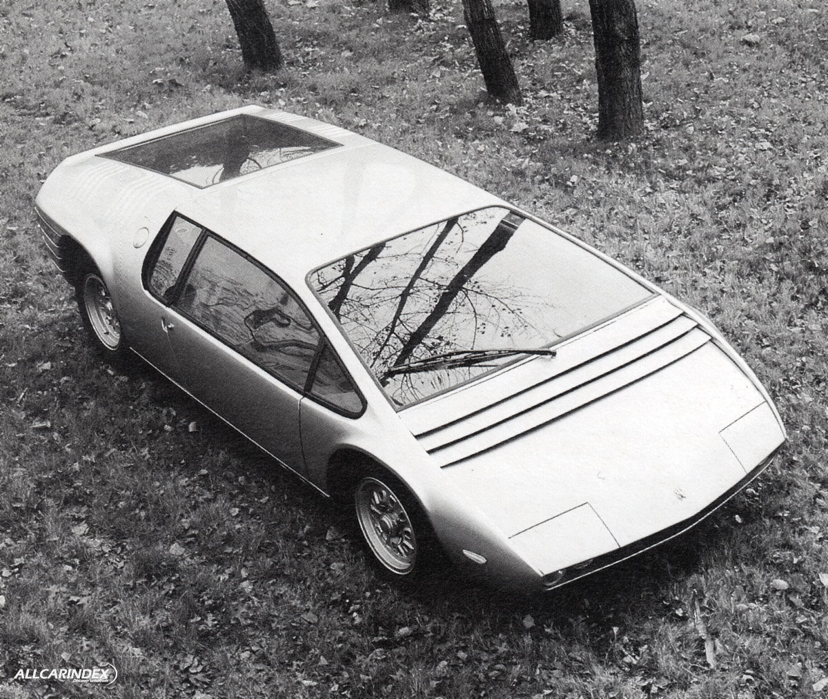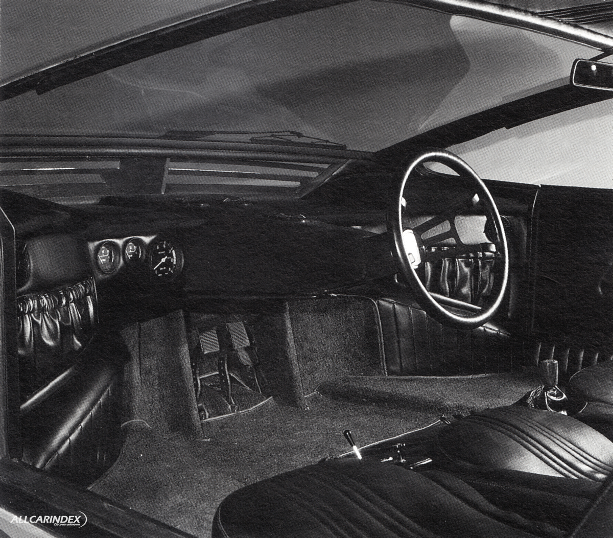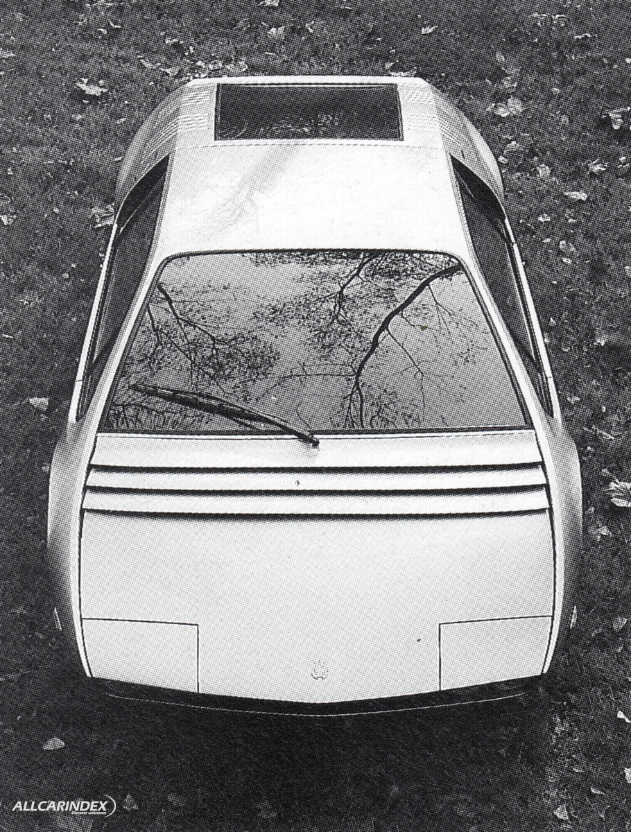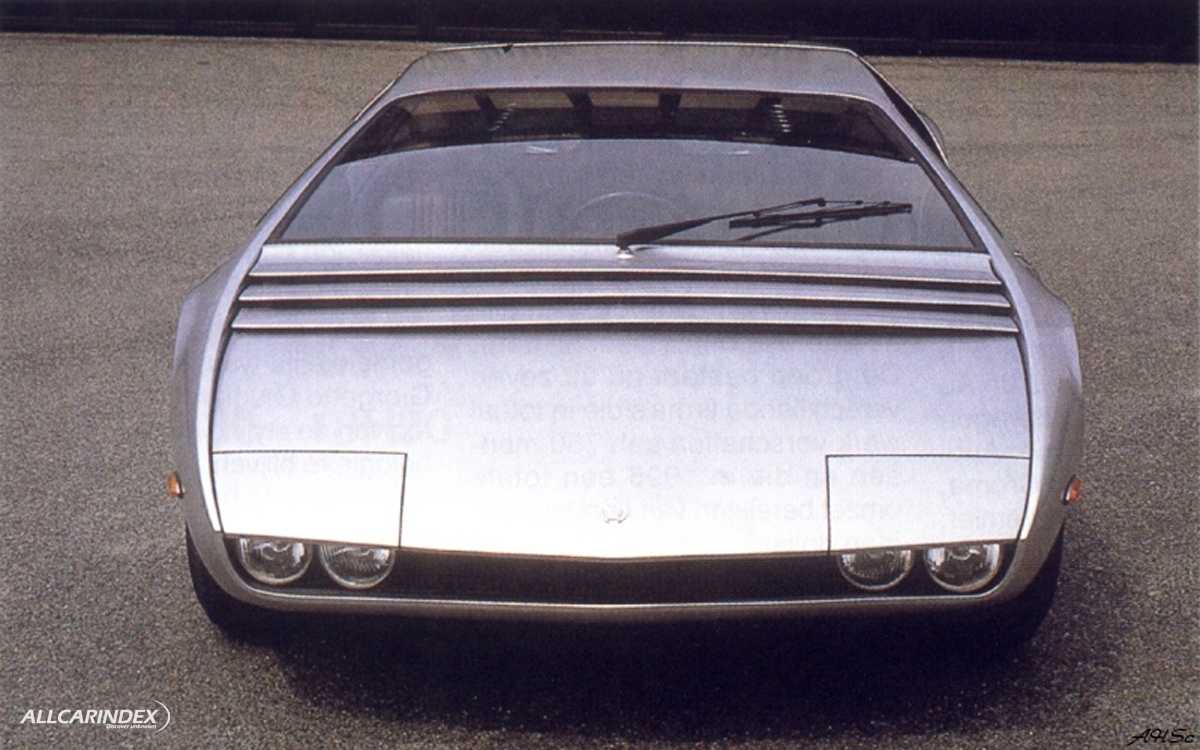 The use of this solution is managed by the driver through three horizontal air-wings which can be positioned from the interior. Such a system introduces a personal touch without interrupting the windscreen-bonnet line. This is also an advantage when maintenance work must be done to the brake pumps, to the radiator, the batteries and the heating system. The air-wings provide adequate interior ventilation and the correct functioning of the heating system, but they are closed at high speed. The side view gives the impression of a marked aerodynamic-shape, recalling in fact the shape of a bullet. The windows, instead of ending at the cut of the front door, continue almost to the limit of the wheel arches. The smooth surface of the side is interrupted at the height of the rocker where a brushed aluminium grille is the only decoration, openly following the treatment carried out by Giugiaro on Bertone's Iso Grifo coupe, with a touch that allows its visual encumbrance to be lightened. The headlights are partially concealed by the bonnet that begins flush with the mudguard and continues, more recessed, as far as the windscreen base. The roof drops slightly towards the rear window almost horizontally, and this becomes even more obvious if one considers that the roll-bar is only 137mm higher than the sharp edge of the tail frame. The rear end is distinctive for the 4 groups of 5 louvres each which also contribute to reduce its impressiveness. The tail is truncated, cut very high, and it gives the car stability and a powerful appearance. In order to benefit visibility at the rear, an almost horizontal opening was added to the rear window of the roof panel in the upper part of the tail. This contrivance also allowed the engine comparment to be well ventilated. To give movement to the rear end, two exhaust pipes shoot out of the tail frame, one of them is false and allowed the side lights to be housed. The need to show up the sporting vocation of the car even advised against the use of bumpers. The two external side members, which run flush to the doors, and the tanks moved to the engine compartment, have allowed a flat central platform to be used leaving space for interior roominess. These structural contrivances, together with extra width (1855 mm) permitted three sporty looking seats to be housed. The driving position is central and the steering-wheel is strangely situated in an almost provocative way: it has a chalice-shaped structure which is deformable on impact. From above, by looking through the rear window, one can appreciate the powerful yet extraordinarily balanced architecture of the 8 cylinder engine. The Chevrolet V8 engine is mounted in a longitudinal rear position, immediately behind the seats. This lay-out is markedly different from that of the Bizzarrini series sports car with a front engine. The 4-speed injection mechanical engine, mounted as an experiment, delivers 400 bhp and it can push the prototype to a speed of 330 km per hour.