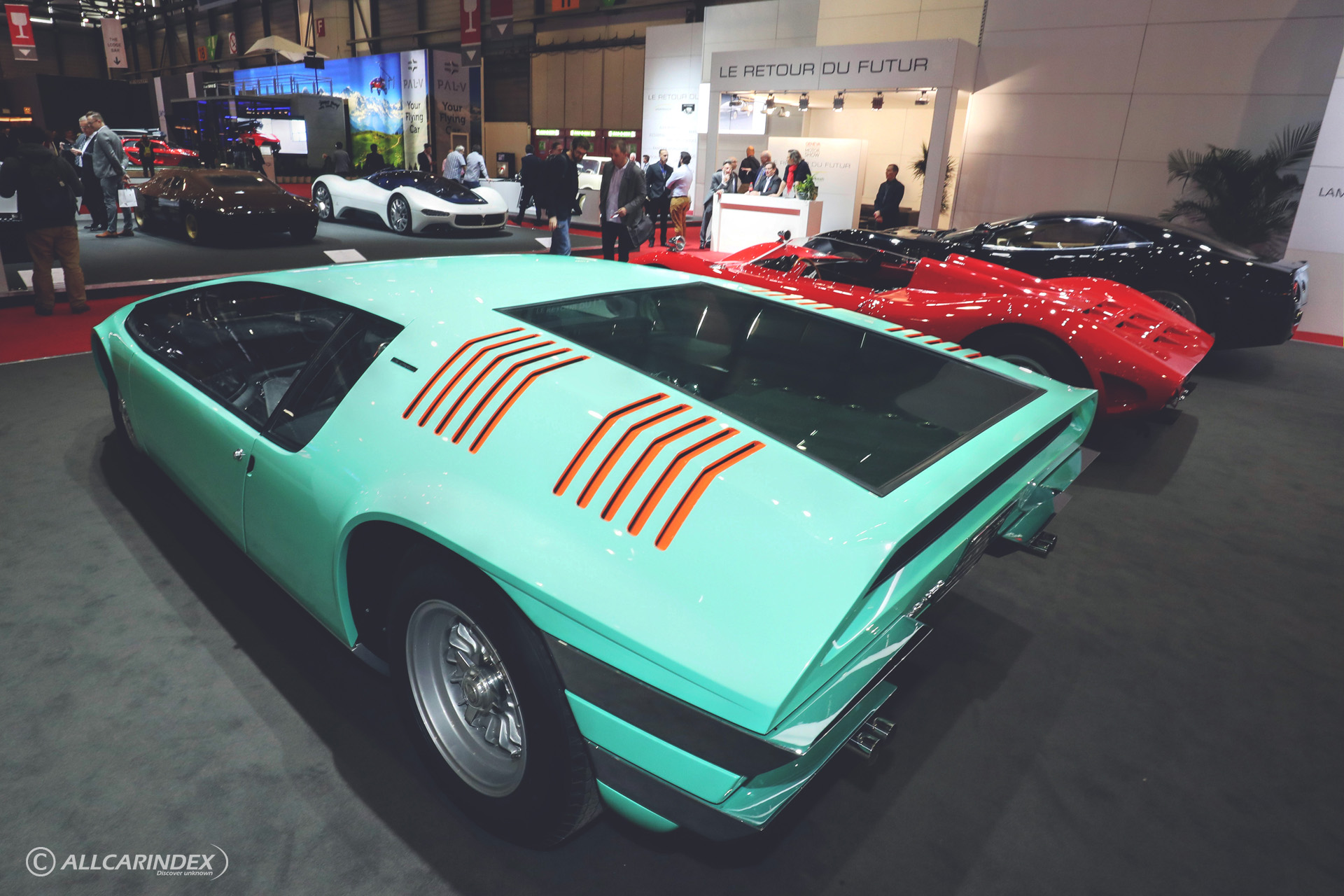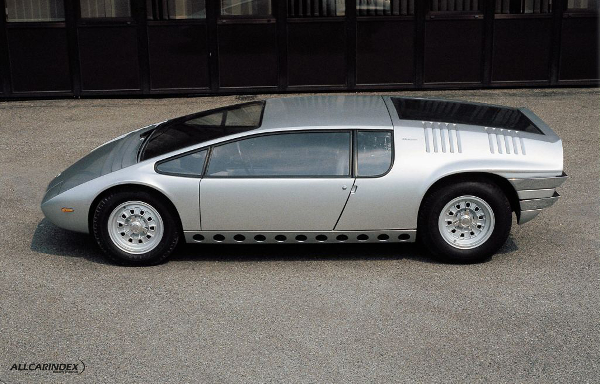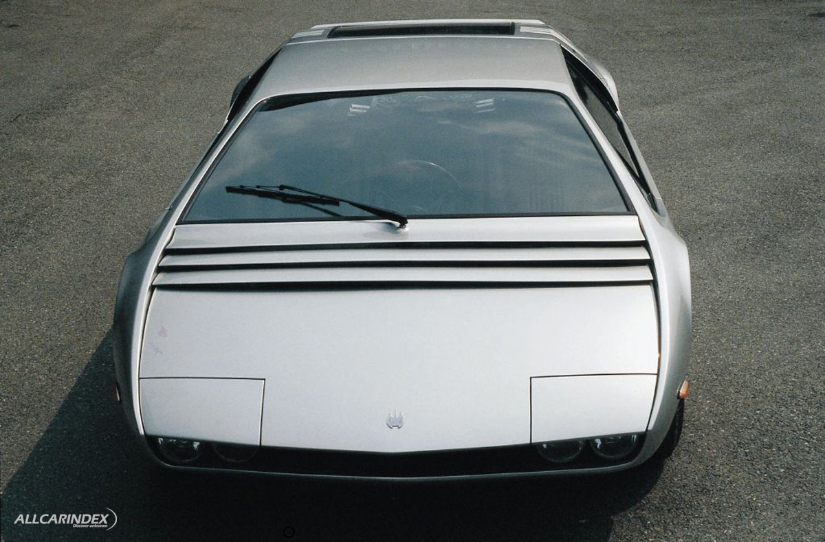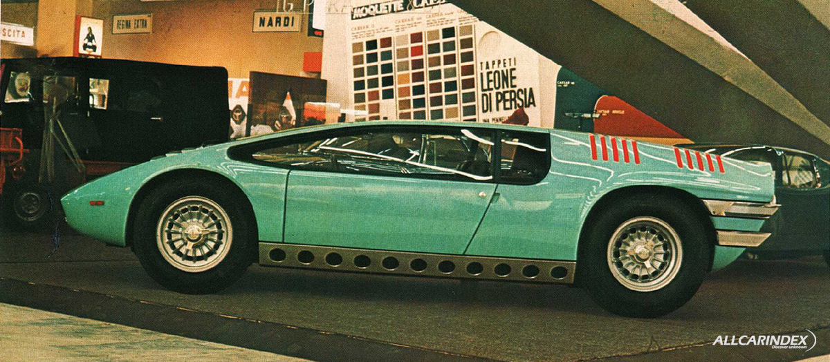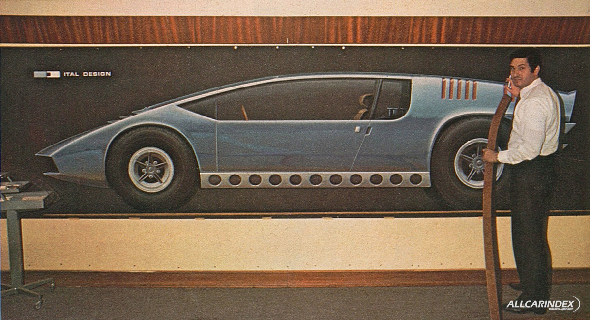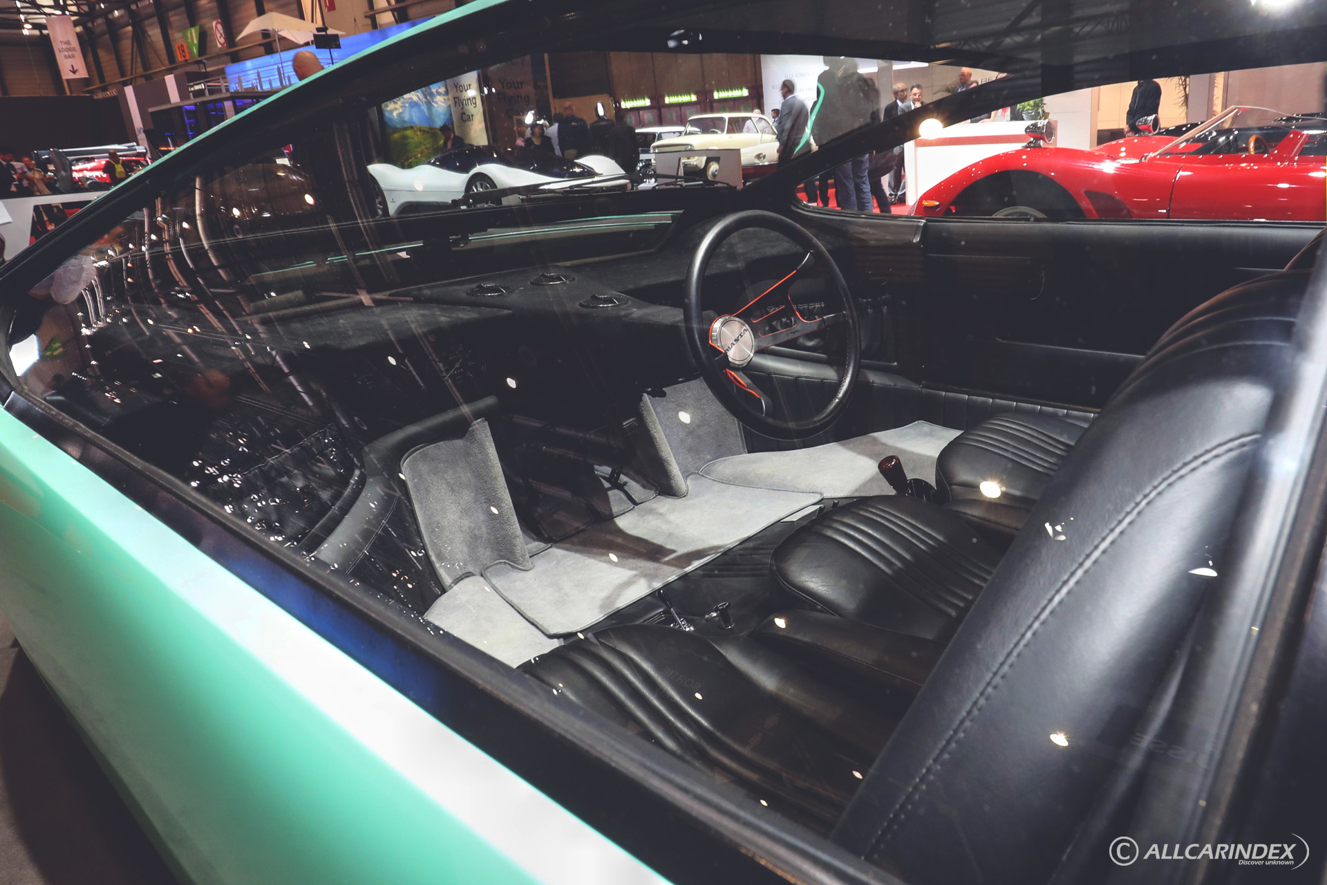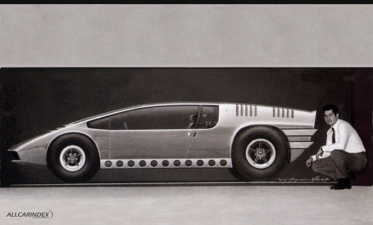 The use of this solution is managed by the driver through three horizontal air-wings which can be positioned from the interior. Such a system introduces a personal touch without interrupting the windscreen-bonnet line. This is also an advantage when maintenance work must be done to the brake pumps, to the radiator, the batteries and the heating system. The air-wings provide adequate interior ventilation and the correct functioning of the heating system, but they are closed at high speed. The side view gives the impression of a marked aerodynamic-shape, recalling in fact the shape of a bullet. The windows, instead of ending at the cut of the front door, continue almost to the limit of the wheel arches. The smooth surface of the side is interrupted at the height of the rocker where a brushed aluminium grille is the only decoration, openly following the treatment carried out by Giugiaro on Bertone's Iso Grifo coupe, with a touch that allows its visual encumbrance to be lightened. The headlights are partially concealed by the bonnet that begins flush with the mudguard and continues, more recessed, as far as the windscreen base. The roof drops slightly towards the rear window almost horizontally, and this becomes even more obvious if one considers that the roll-bar is only 137mm higher than the sharp edge of the tail frame. The rear end is distinctive for the 4 groups of 5 louvres each which also contribute to reduce its impressiveness. The tail is truncated, cut very high, and it gives the car stability and a powerful appearance. In order to benefit visibility at the rear, an almost horizontal opening was added to the rear window of the roof panel in the upper part of the tail. This contrivance also allowed the engine comparment to be well ventilated. To give movement to the rear end, two exhaust pipes shoot out of the tail frame, one of them is false and allowed the side lights to be housed. The need to show up the sporting vocation of the car even advised against the use of bumpers. The two external side members, which run flush to the doors, and the tanks moved to the engine compartment, have allowed a flat central platform to be used leaving space for interior roominess. These structural contrivances, together with extra width (1855 mm) permitted three sporty looking seats to be housed. The driving position is central and the steering-wheel is strangely situated in an almost provocative way: it has a chalice-shaped structure which is deformable on impact. From above, by looking through the rear window, one can appreciate the powerful yet extraordinarily balanced architecture of the 8 cylinder engine. The Chevrolet V8 engine is mounted in a longitudinal rear position, immediately behind the seats. This lay-out is markedly different from that of the Bizzarrini series sports car with a front engine. The 4-speed injection mechanical engine, mounted as an experiment, delivers 400 bhp and it can push the prototype to a speed of 330 km per hour.