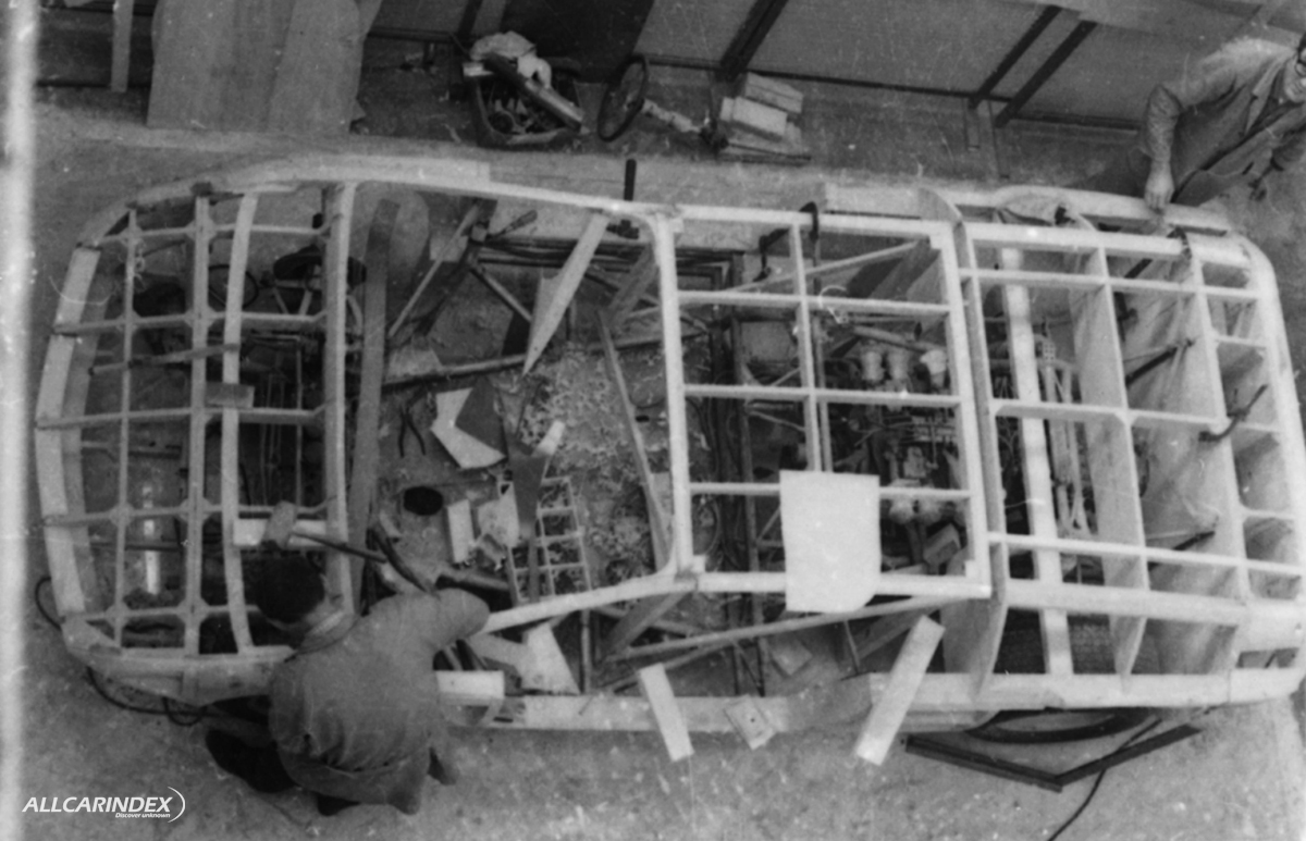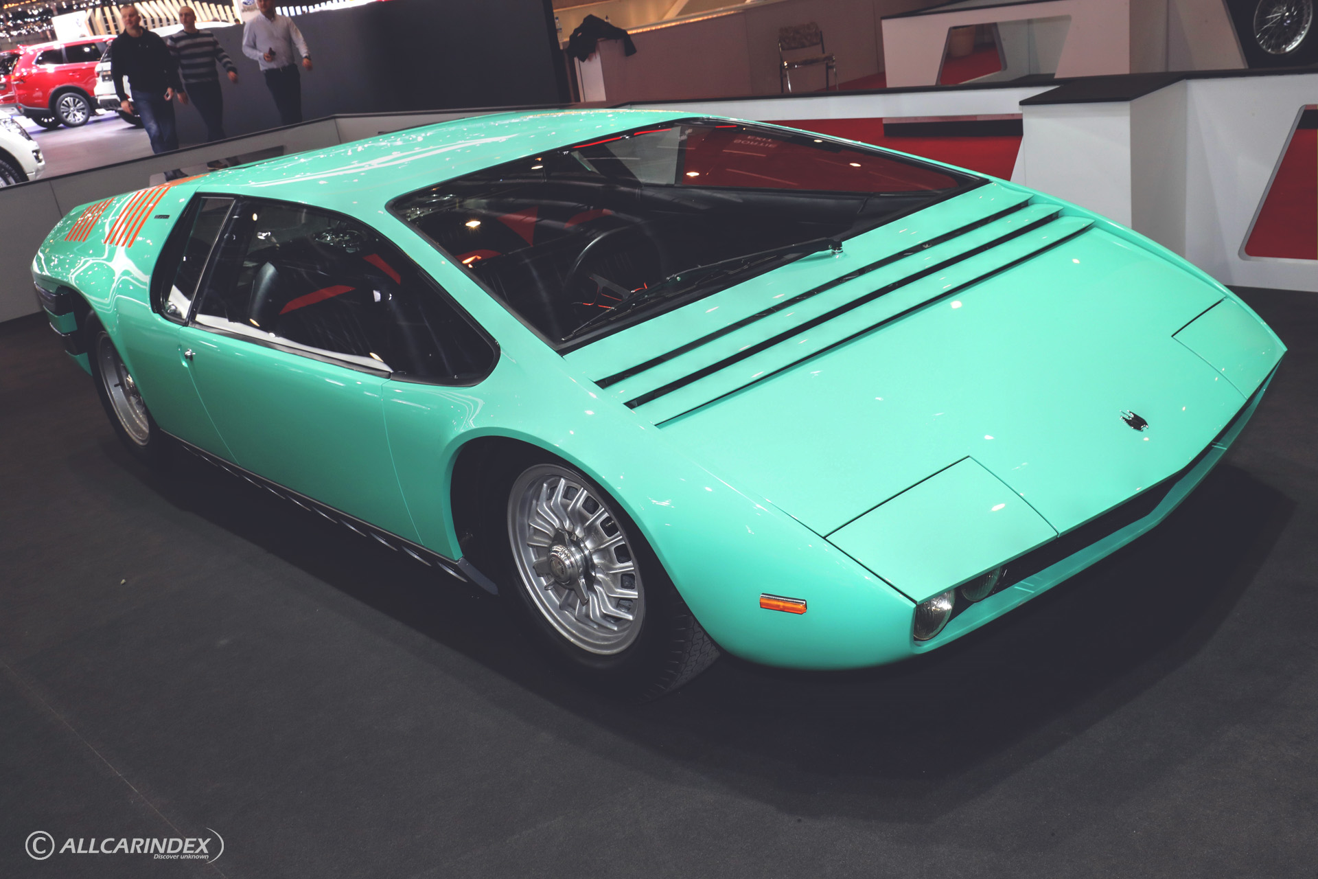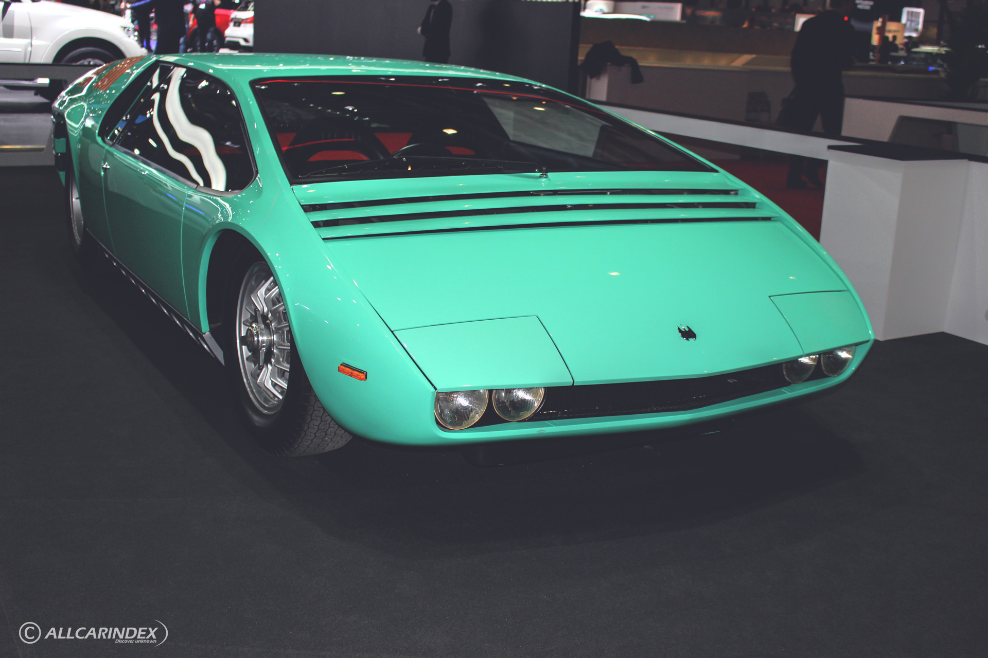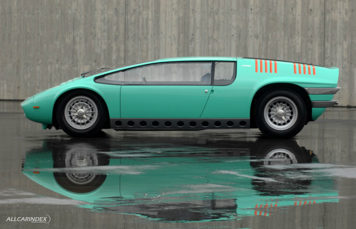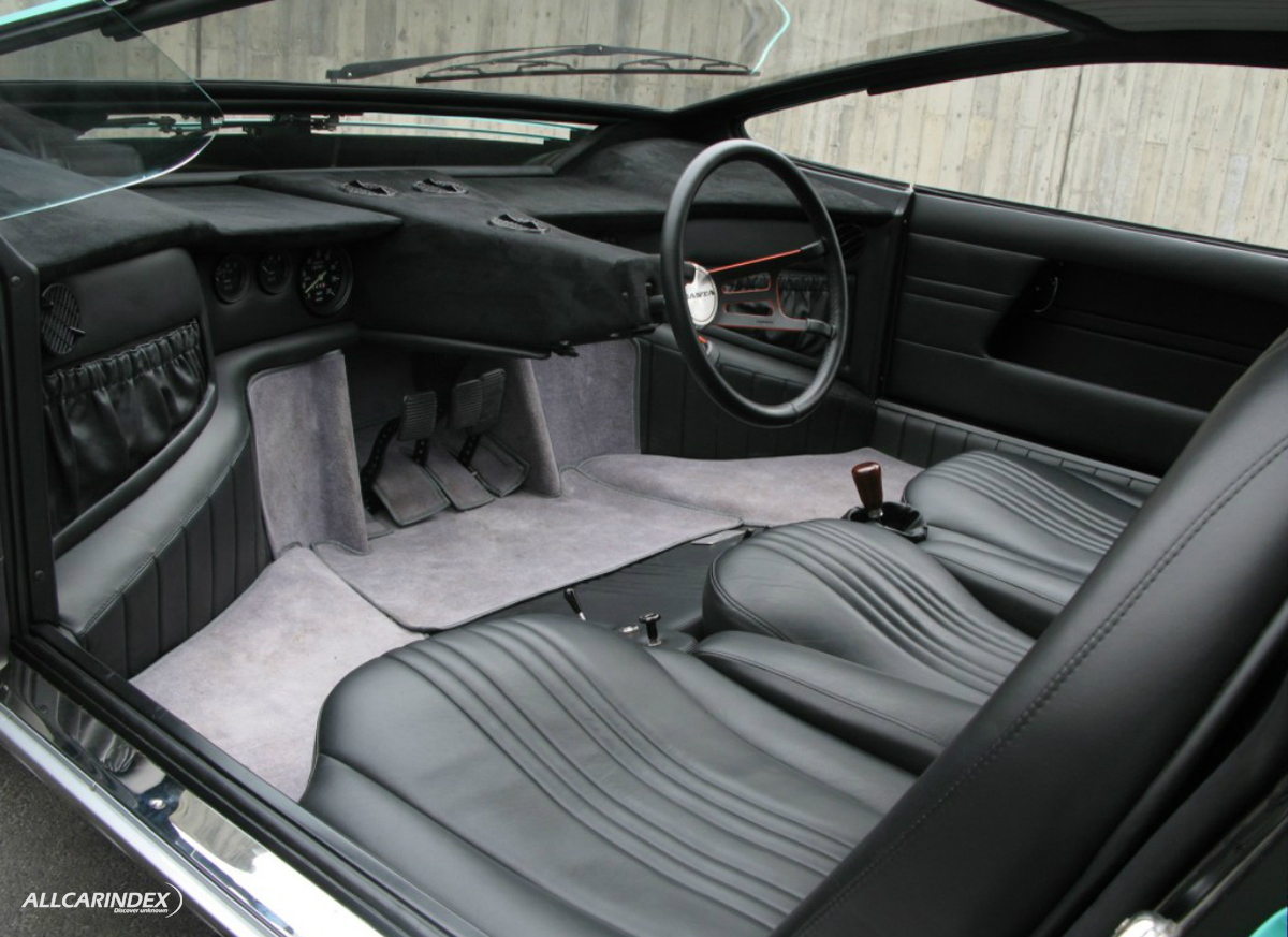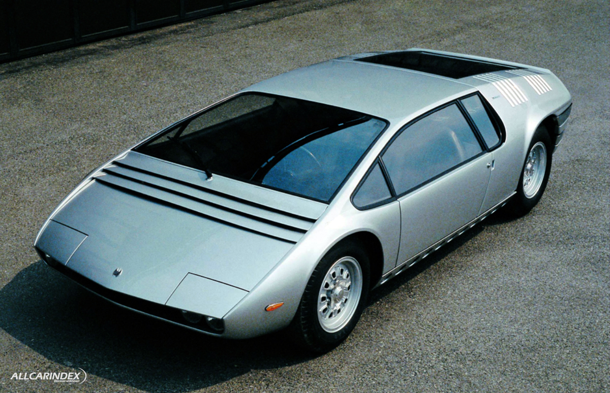 The use of this solution is managed by the driver through three horizontal air-wings which can be positioned from the interior. Such a system introduces a personal touch without interrupting the windscreen-bonnet line. This is also an advantage when maintenance work must be done to the brake pumps, to the radiator, the batteries and the heating system. The air-wings provide adequate interior ventilation and the correct functioning of the heating system, but they are closed at high speed. The side view gives the impression of a marked aerodynamic-shape, recalling in fact the shape of a bullet. The windows, instead of ending at the cut of the front door, continue almost to the limit of the wheel arches. The smooth surface of the side is interrupted at the height of the rocker where a brushed aluminium grille is the only decoration, openly following the treatment carried out by Giugiaro on Bertone's Iso Grifo coupe, with a touch that allows its visual encumbrance to be lightened. The headlights are partially concealed by the bonnet that begins flush with the mudguard and continues, more recessed, as far as the windscreen base. The roof drops slightly towards the rear window almost horizontally, and this becomes even more obvious if one considers that the roll-bar is only 137mm higher than the sharp edge of the tail frame. The rear end is distinctive for the 4 groups of 5 louvres each which also contribute to reduce its impressiveness. The tail is truncated, cut very high, and it gives the car stability and a powerful appearance. In order to benefit visibility at the rear, an almost horizontal opening was added to the rear window of the roof panel in the upper part of the tail. This contrivance also allowed the engine comparment to be well ventilated. To give movement to the rear end, two exhaust pipes shoot out of the tail frame, one of them is false and allowed the side lights to be housed. The need to show up the sporting vocation of the car even advised against the use of bumpers. The two external side members, which run flush to the doors, and the tanks moved to the engine compartment, have allowed a flat central platform to be used leaving space for interior roominess. These structural contrivances, together with extra width (1855 mm) permitted three sporty looking seats to be housed. The driving position is central and the steering-wheel is strangely situated in an almost provocative way: it has a chalice-shaped structure which is deformable on impact. From above, by looking through the rear window, one can appreciate the powerful yet extraordinarily balanced architecture of the 8 cylinder engine. The Chevrolet V8 engine is mounted in a longitudinal rear position, immediately behind the seats. This lay-out is markedly different from that of the Bizzarrini series sports car with a front engine. The 4-speed injection mechanical engine, mounted as an experiment, delivers 400 bhp and it can push the prototype to a speed of 330 km per hour.