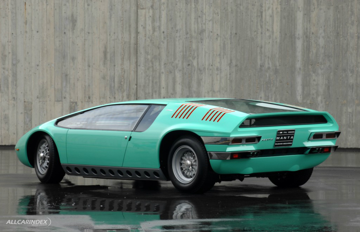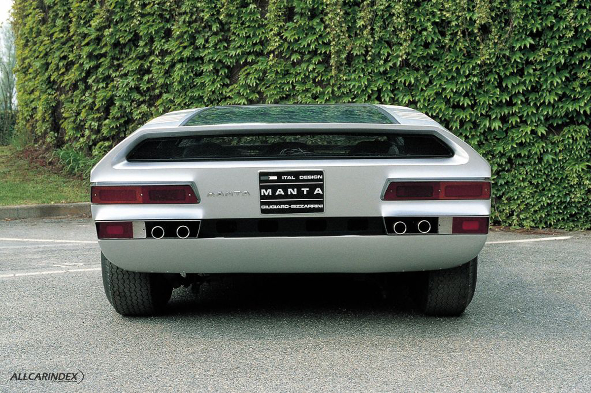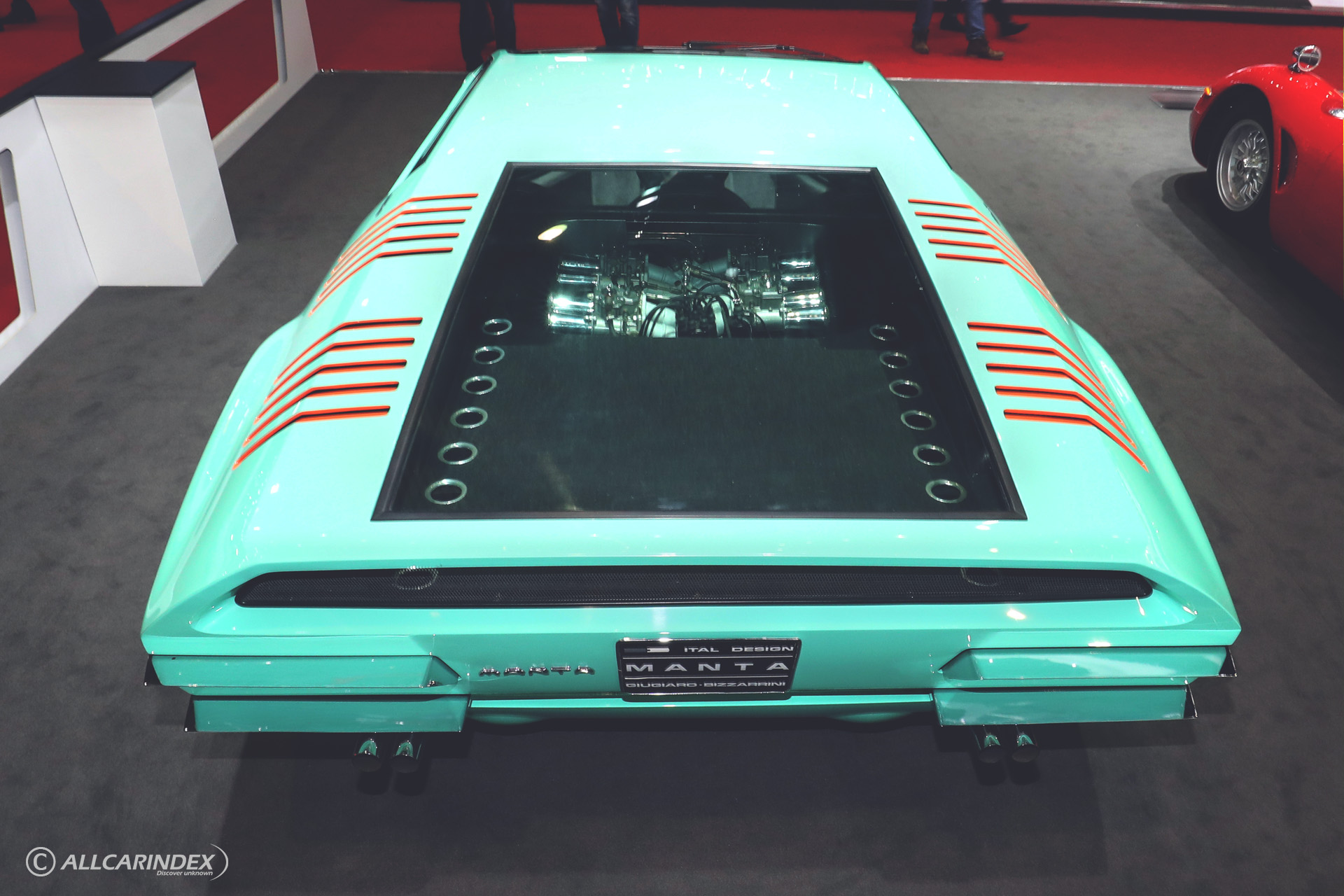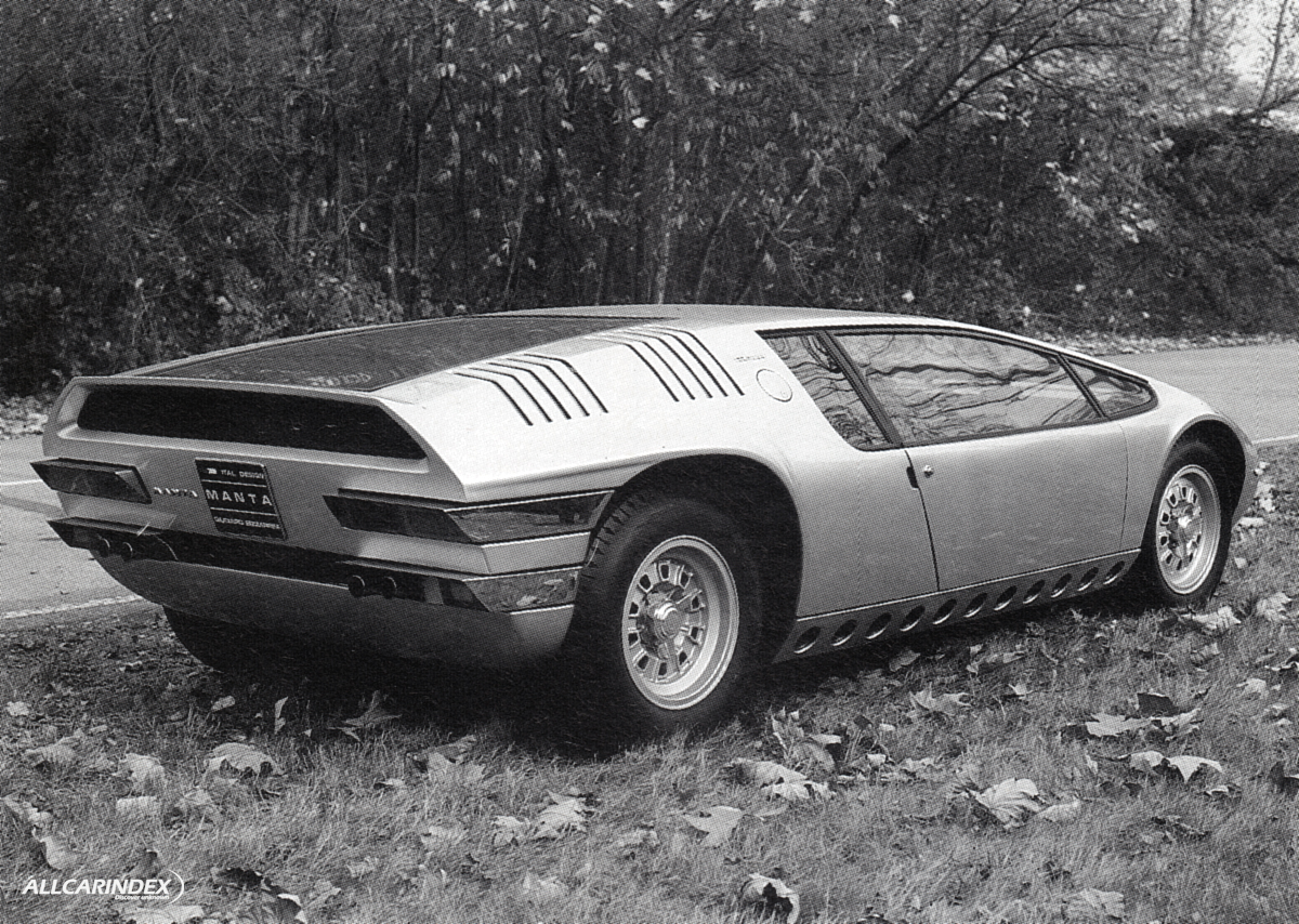 The Manta is particularly significant for Giugiaro as it was the first prototype he developed as an independent designer. At his debut in this new role, he chose the theme of a high-performance two-seater coupe typical of the traditions of the Turin body-maker. The absolute freedom of this new position led him to conceive the bold lines of a single-box coupe. The chassis at Giugiaro's disposal was the one the engineer Giotto Bizzarrini obtained by modifying a model of the Grip Competizione which had a tubular structure. Equipped with the suspension and kinematic motion of the rear-engined prototype, it has already been tried out at Le Mans and in other races. The front end view shows a very slanted windscreen (15°) which fits harmoniously into the union between the bonnet and the roof. Standing in front of the prototype, one can guess how the car's name comes from the 'pincer'-like appearance of the front end, which is reminiscent of the majestic fish. In the close driving position, a traditionally weak point in reduced-height sports cars, the exterior of the transparent surfaces below the level of the windscreen offers valid assistance.