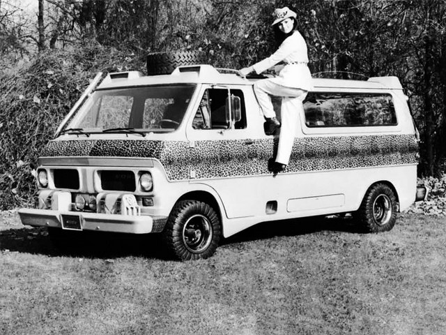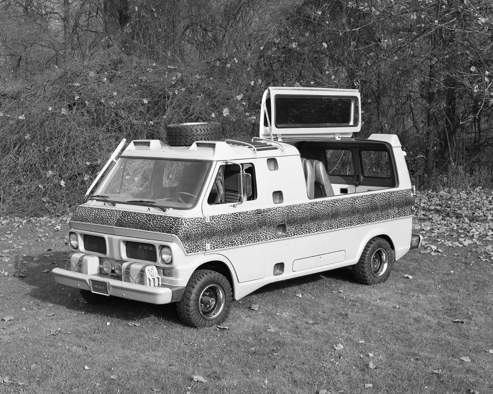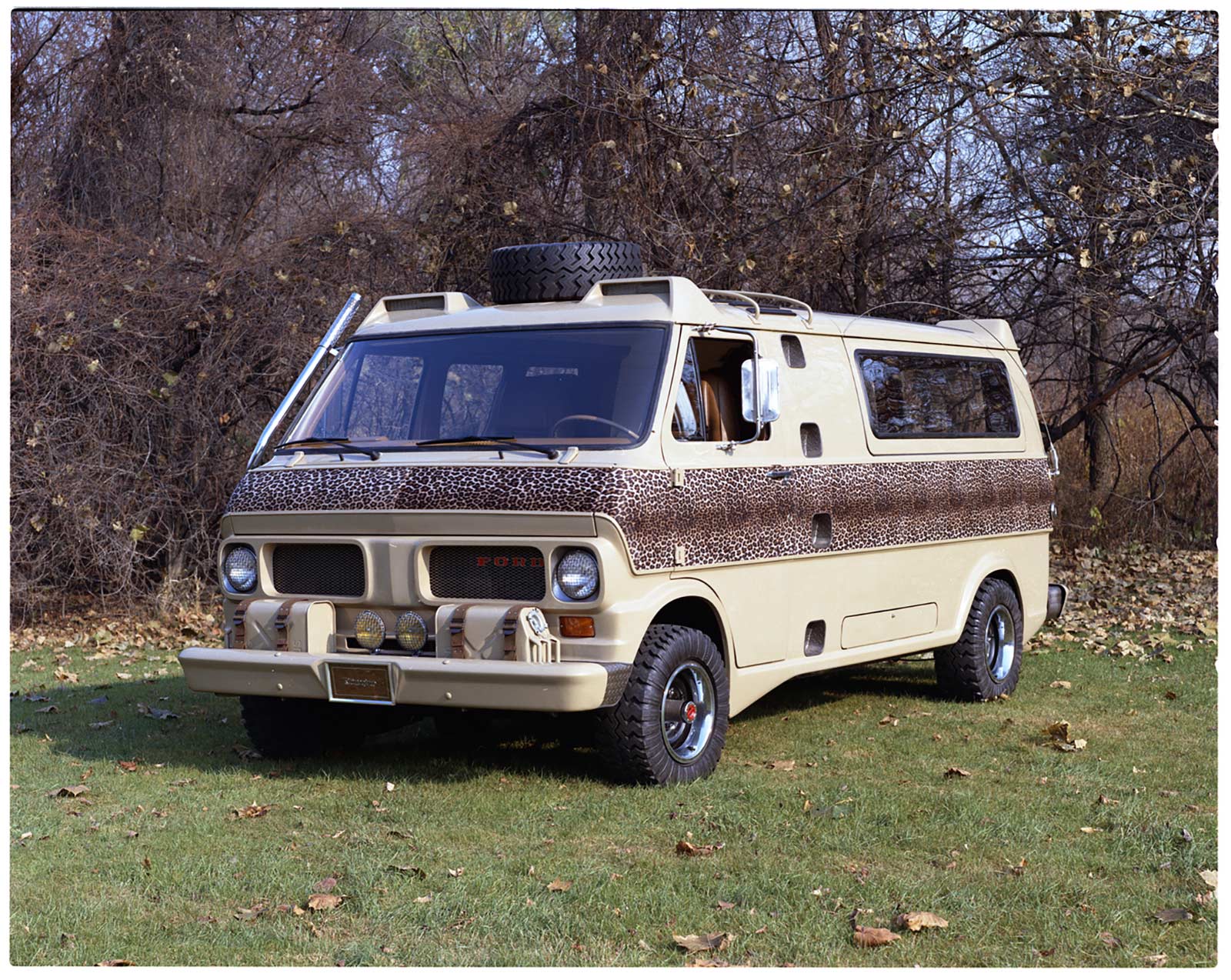 Let’s get this out of the way: the Econoline Kilimanjaro isn’t exactly subtle. This is a van with leopard skin print. Ford wrapped a solid 15-inch-wide band of it around the vehicle’s beige exterior, because, well, it’s the ‘70s, and subtlety was for people without spotlights mounted on their roofs. And that’s not a figure of speech: the Kilimanjaro literally has spotlights in containers above the windshield, a setup that’ll let you sweep the bush for game—or perhaps just the nearest zebra crossing.