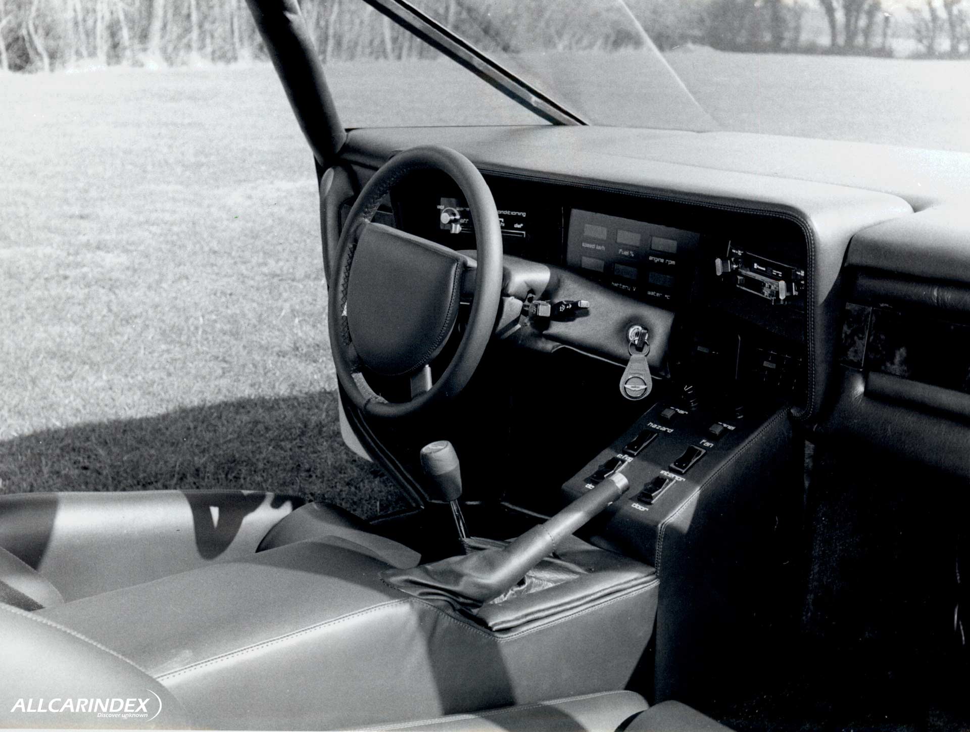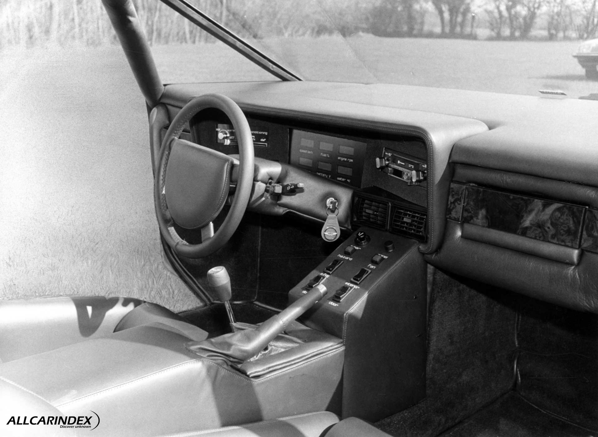 Visually, the car was as dramatic as its specification. The flush nose hid retractable headlamps, and the rear was marked by a sharply cut vertical tail and low-set window line. The gullwing doors dominated the profile, opening high into the air to reveal a minimalist interior trimmed by Connolly and equipped with modern electronics: a National Panasonic stereo system, digital readouts, and LCD displays for instruments.