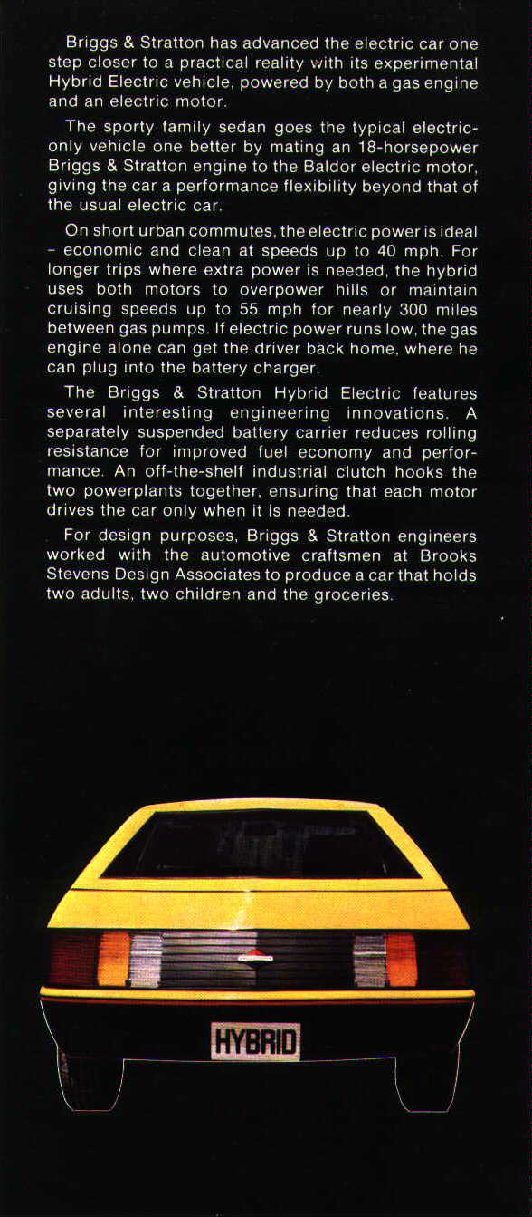 Back in 1980, Briggs & Stratton raised the bar when it came to electric cars with their groundbreaking Hybrid Electric vehicle. This sporty family sedan was not your typical electric-only vehicle - it was equipped with both a gas engine and an electric motor, giving it a performance edge that was unheard of at the time.