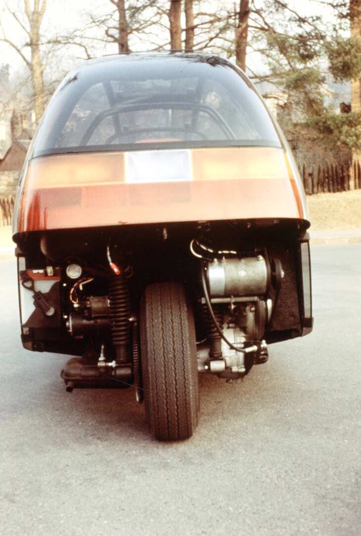 The Cockpit was designed as a possible urban commuter car of the future, offering outstanding projected fuel economy paired with optimum cruising speed for inter-city highway transportation during an energy crisis. Weighing in at only 770 pounds, this tiny car was projected to get better than 75 miles per gallon from its motorcycle-like engine. Its triangular chassis, equipped with additional side support bars, carried all mechanical components, while the transverse-spring front suspension and rear-mounted powerplant promised a smooth driving experience.