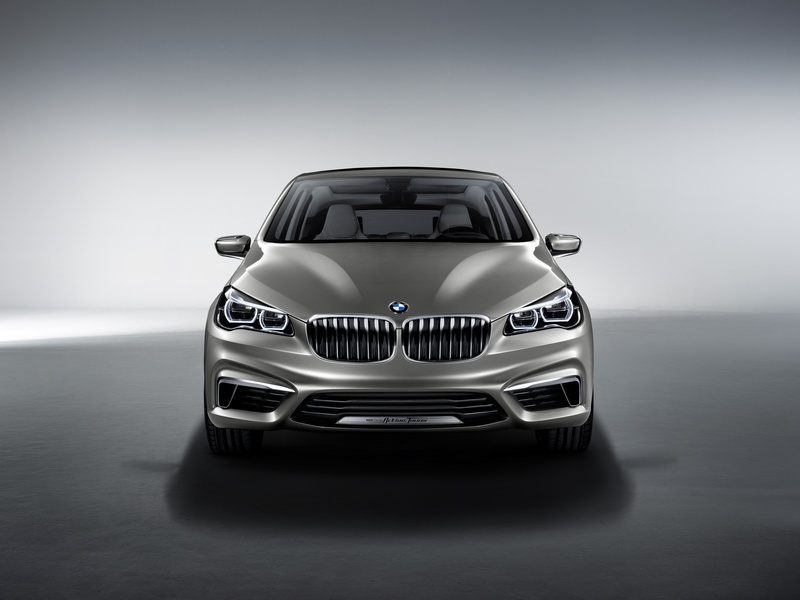the bmw concept active tourer unmistakably retains the characteristically expressive bmw front view. the dominating element here is the distinctive, slightly front-tilted bmw radiator grille. the striking twin headlines with led positioning lights (eyebrows) stretching far back into the side panels and the multi-faceted front apron combine to reinforce the sporty presence of the bmw concept active tourer. furthermore, the two large outer air inlets below the headlights emphasise the impression of width created by the front view.