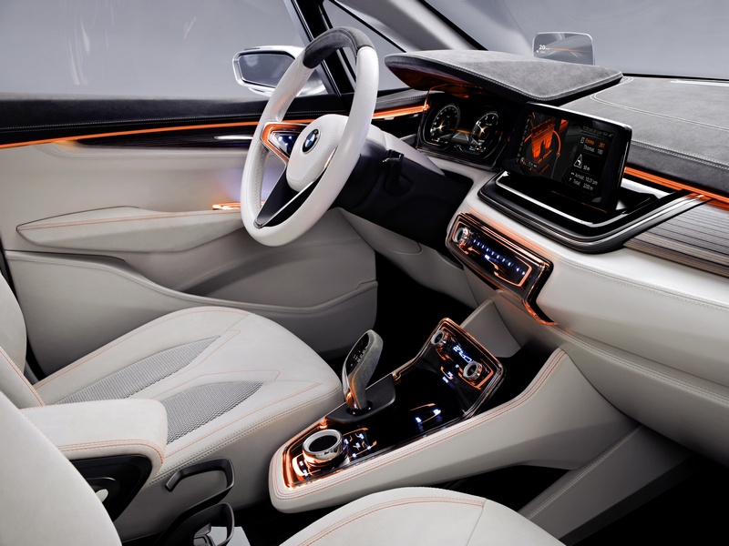 the generously designed interior of the bmw concept active tourer is both transparent and refreshingly new. the open-pore laminated wood milled from a single block provides the visual link between the upper and low decor surfaces of the instrument panel. this creates a very elegant and light overall impression in the front section of the interior. the door trim panels and seats are covered in light, velvety soft full-grain leather and smooth leather, providing a silky, shimmering gloss which emphasises the luxurious, elegant ambience of the interior. there are also orange contrasting seams which underscore the vehicle's sporty character. the bmw concept active tourer offers an entirely new sense of space. the centre console appears to hover between the two front seats with a smooth transition to the dashboard. this arrangement guarantees maximum legroom for both driver and front passenger.