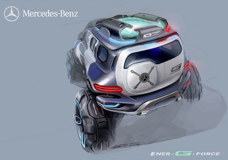 the mounted roof distinctive to the g-class and the tripartite glass area also cite the fundamental genes of the classic off-roader from mercedes-benz, but represent a clear step forward. this is also evident in the large wheels, whose 20-inch rims give the ener-g-force a powerful, towering stance. the ener-g-force also plays on the utility factor in an entirely new way. for instance, the distinctive feature in the rear is a slightly off-centre pull-out compartment whose cover takes up the characteristic look of the spare wheel carrier of the classic g-class. this pull-out tool box can hold a wide variety of equipment items that consequently are quickly in reach without having to open the whole liftgate.