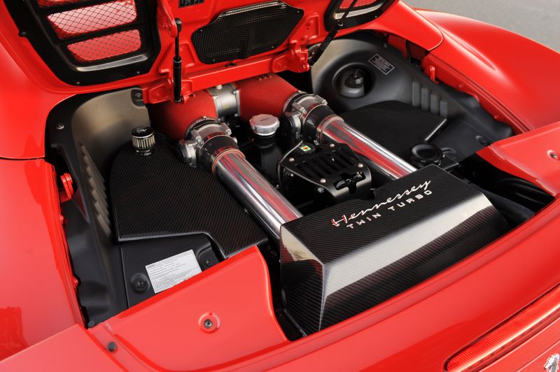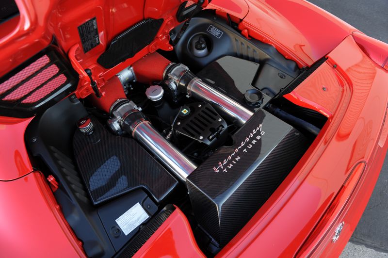 The Ferrari 458's HPE700 Twin Turbo upgrade sells for $59,995 installed and includes a 1-year/12,000-mile limited warranty and full dyno tuning and road testing. Serial-numbered aluminum plaques for both the engine compartment and dash are part of the upgrade, as is Hennessey exterior badging.