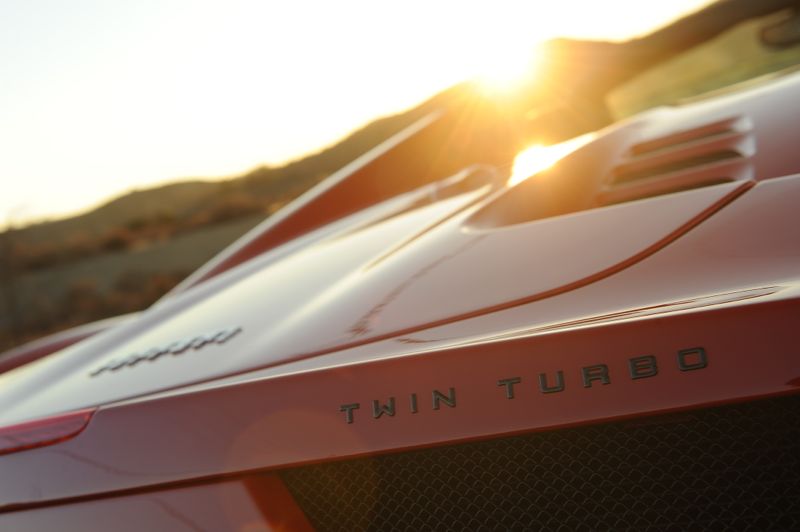 Most of the upgrade's componentry is concealed beneath custom-made carbon-fiber covers, but if you stripped them away you'd see the low-inertia ball-bearing turbochargers tucked up neatly toward the tail end of the dual-clutch sequential 7-speed gearbox, the TIG-welded, mandrel-bent T304 stainless tubing, the twin wastegates and blow-off valves and an especially trick aluminum plenum that contains the air-to-water charge-cooler element.
