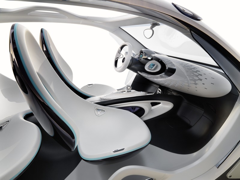 the design of the spherical instrument cluster and the single-spoke steering wheel are reminiscent of the original smart. two smartphones are mounted on the dashboard and on the centre tunnel at the rear for cutting-edge connectivity and tailor-made entertainment for all four passengers.
