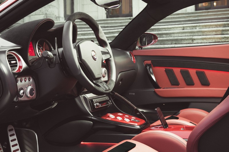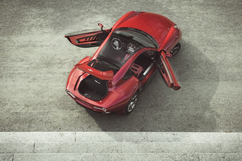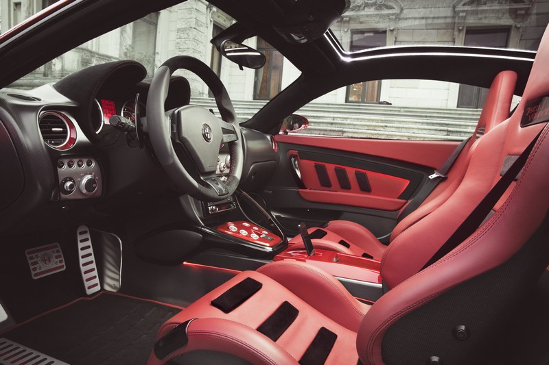 The Alfa Romeo 8C’s steel space-frame and other structural elements were retained to guarantee torsion stiffness, high performance and the quality standard. The frame members and the central carbon cell remained unchanged. Elements of the underpinning and the body, such as the engine bay and firewall, the windscreen and cowl, the a-pillar and the locks and hinges have been retained too, just as the dashboard and instruments, the pedals and the steering wheel.