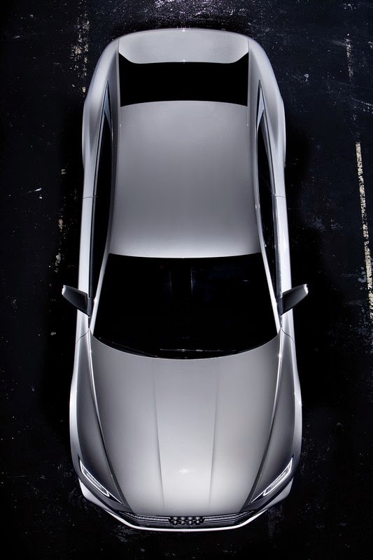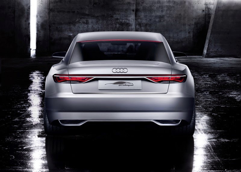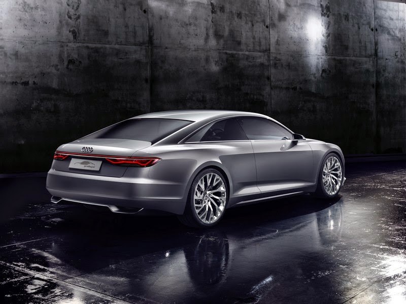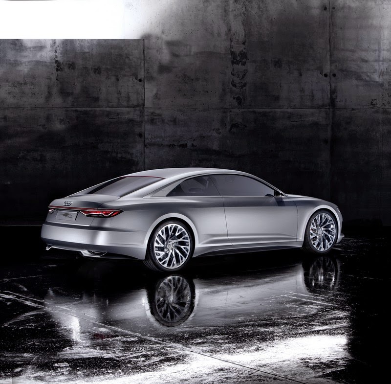 the rear section of the audi prologue also breaks with conventions. it is angled in the driving direction and is reminiscent of the side and rear views of a luxurious yacht; the sickle-shaped seam between the side panel and the bumper emphasizes this dynamism. the edge of the trunk lid, which is executed as a discreet spoiler, picks up on the blister line coming from the side panel. between the cpillars, the rear window has a concave inward curve – it closes off the passenger compartment while enabling convenient cargo loading with the separate trunk lid. the audi prologue unites the positive aspects of a saloon with the aesthetic highlights of a coupe.