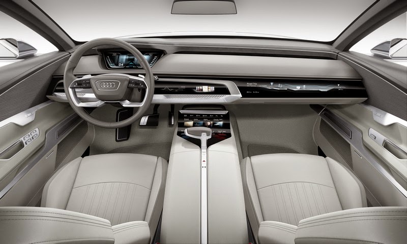 tautly stretched lines and lean geometric forms give the interior a light and clear ambience. the instrument panel has a light and elegant appearance with its strictly horizontal layout that is not interrupted anywhere, and it emphasizes the generous interior width. it lowers itself towards the interior on two levels. the upper level is positioned, like a roof, above the audi virtual cockpit future – an advanced development of the audi virtual cockpit – and above the line of air vents. it is part of the wrap-around – a large arc that encircles the driver and front passenger.