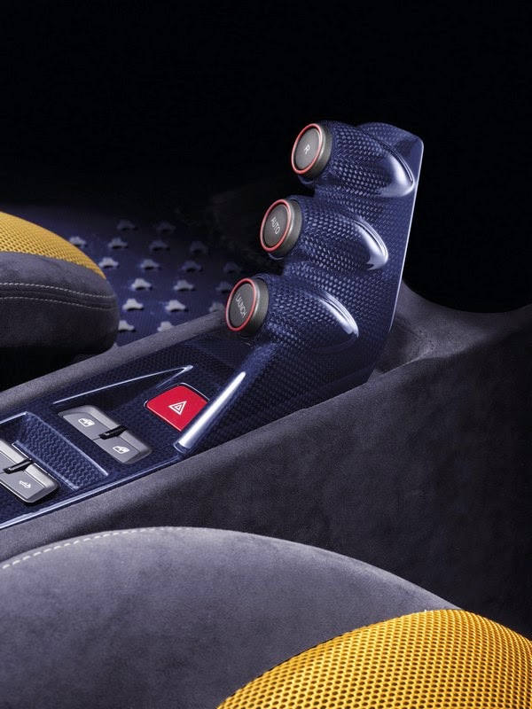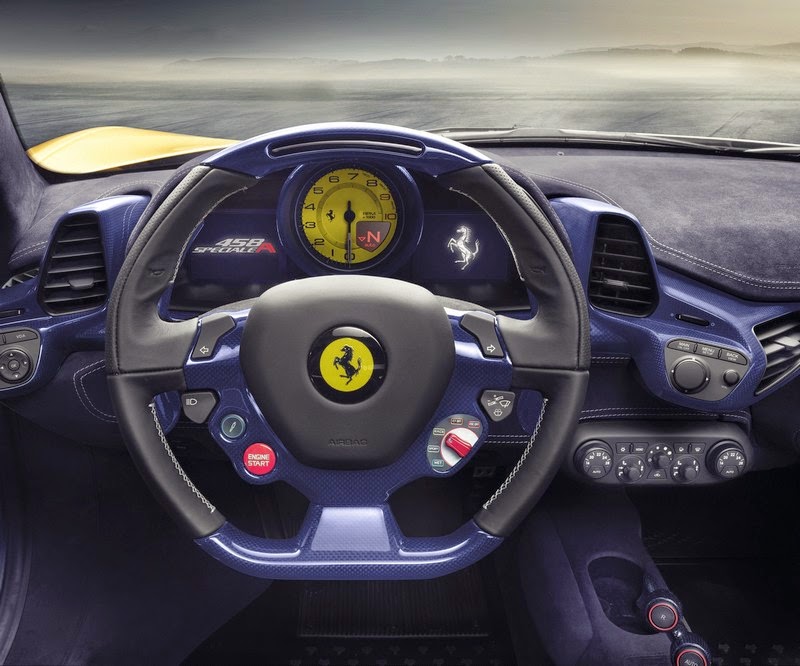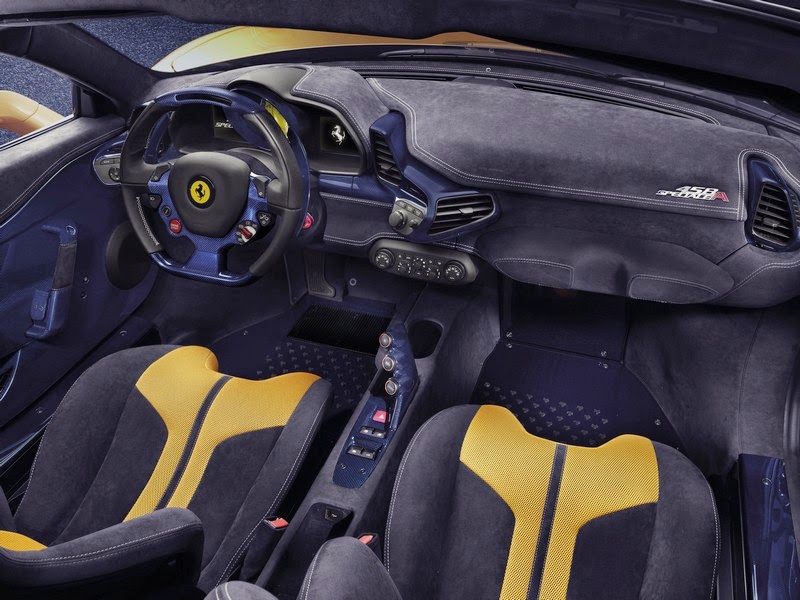 the 458 speciale a is being premiered in a unique triple-layer yellow livery with a blu nart and bianco avus central stripe as well as five-spoke forged wheels in grigio corsa. the cockpit has a distinctive racing-inspired look: lightweight yet exclusive materials have been adopted throughout and, of course, crafted with ferrari’s signature artisanal sophistication. this is particularly true of the finish of the dash, the moulded door panels and central tunnel in an exclusive blue carbon-fibre (also used for the treadplates) as well as the newly-designed seats in alcantara© with contrasting stitching and 3d technical fabric.