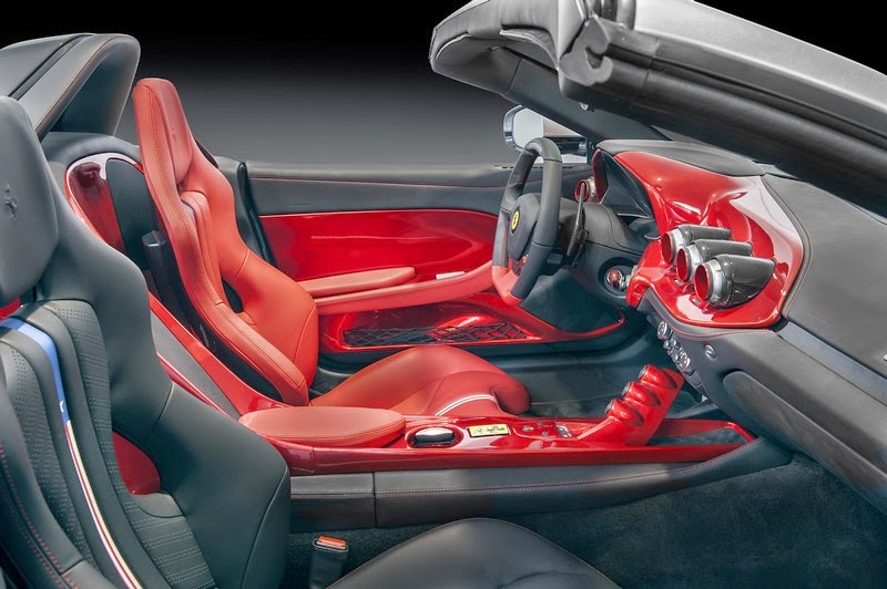 the cabin’s asymmetrical design highlights the driver’s area with sporty red trim, while the passenger side is black, inspired by the historic ferrari competition cars. the cabin trim is exclusive with the dash, tunnel and door panels on the driver’s side all swathed in composite materials. the racing seats also feature a stylised american flag motif on the centre of each seat and backrest.