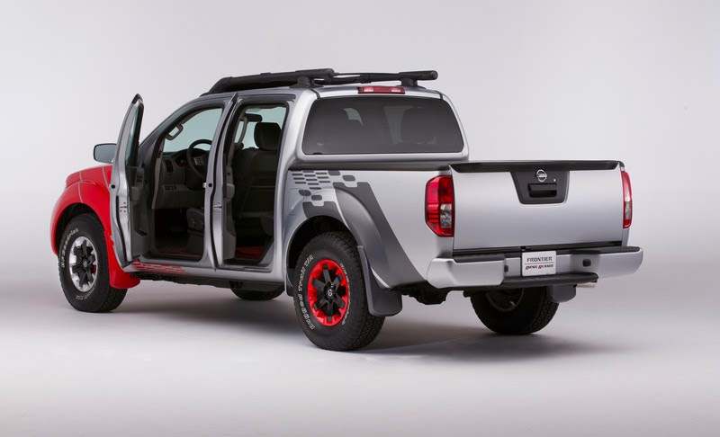 the 16-inch wheels, borrowed from a frontier pro-4x, have been treated with a special two-tone paint – arrest me red for the rear wheels and silver in front, each accented by satin black paint. the brake calipers have also been custom painted in contrasting colors - red front and silver rear.