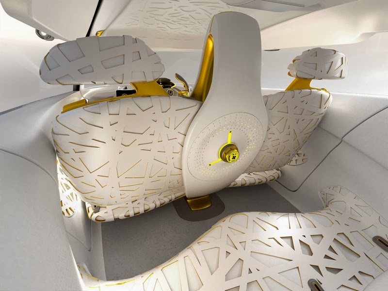 the interior of the kwid concept is designed to serve as a snug cocoon and is inspired by a bird’s nest. the vehicle’s seats, suspended over a solid base in white, give an impression of lightness, while their 2-tone elastomer material provides a sense of brightness. the kwid concept also features rear air conditioning with controls on the driver seat’s back as well as ventilation through concentric perforations. the dashboard is an integrated tablet for commanding the navigation of the flying companion.