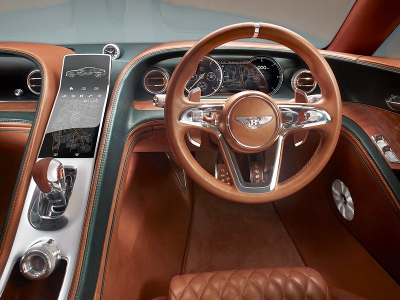 the inspiration for the interior comes from the continuous line that runs around the cabin, driving through the console and into two symmetrical wings before flowing into the door and looping back into the console armrest. two elegant quilted sports seats are positioned either side of the narrow centre console which houses exquisite driver controls and a highly intuitive 12” touch screen. these features combine futuristic technology seamlessly with progressive bentley craftsmanship.